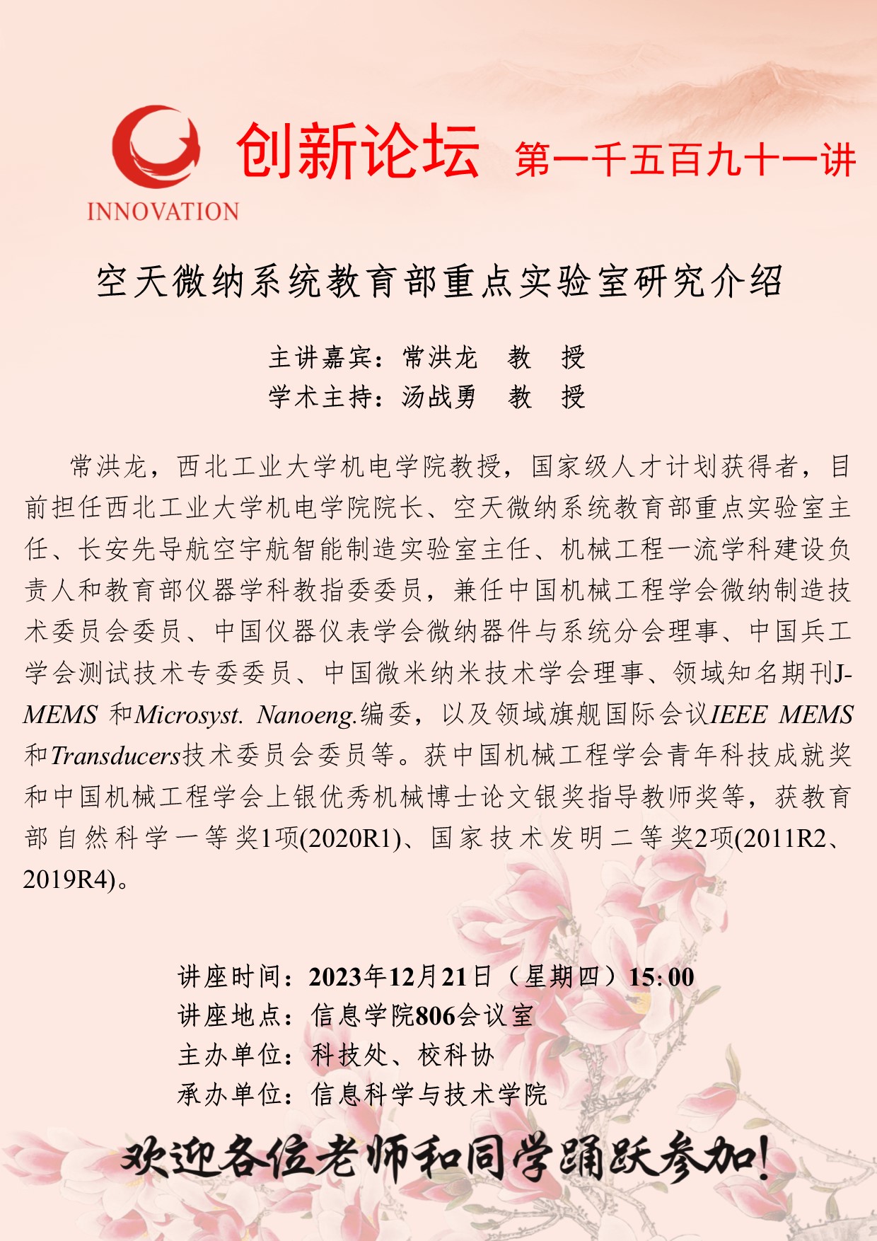 常洪龙 教授 8868体育登录创新论坛第一千五百九十一讲:空天微纳系统教育部重点实验室研究介绍 讲座时间 2023年12月21日(星期四)15:00 讲座地点 信息学院806会议室 讲座人介绍 常洪龙 教授 讲座内容