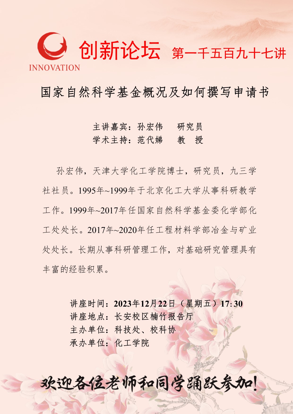 孙宏伟 研究员 8868体育登录创新论坛第一千五百九十七讲:国家自然科学基金概况及如何撰写申请书 讲座时间 2023年12月22日(星期五)17:30 讲座地点 长安校区楠竹报告厅 讲座人介绍 孙宏伟 研究员 讲座内容