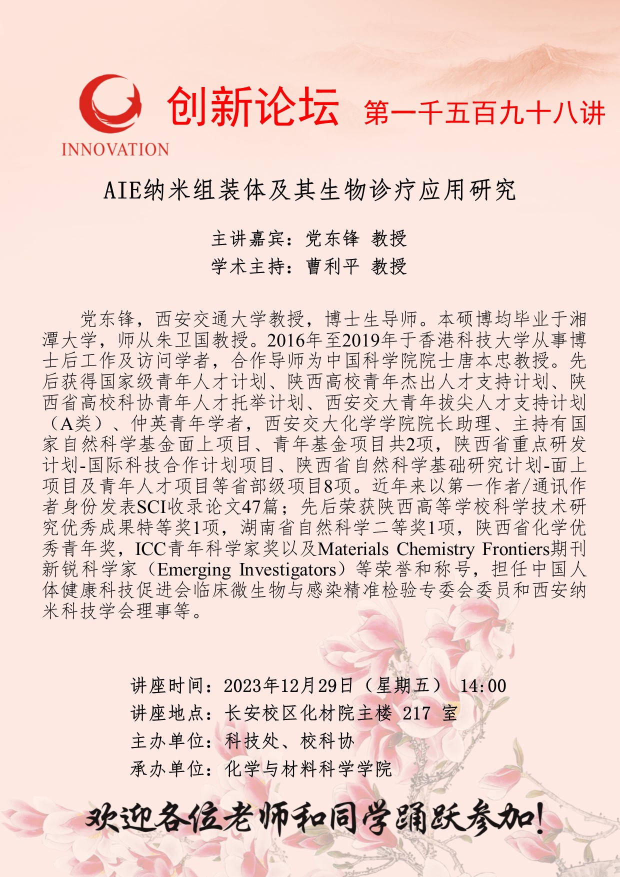 党东锋 教授 8868体育登录创新论坛第一千五百九十八讲:AIE纳米组装体及其生物诊疗应用研究 讲座时间 2023年12月29日(星期五) 14:00 讲座地点 长安校区化材院主楼217室 讲座人介绍 党东锋 教授 讲座内容