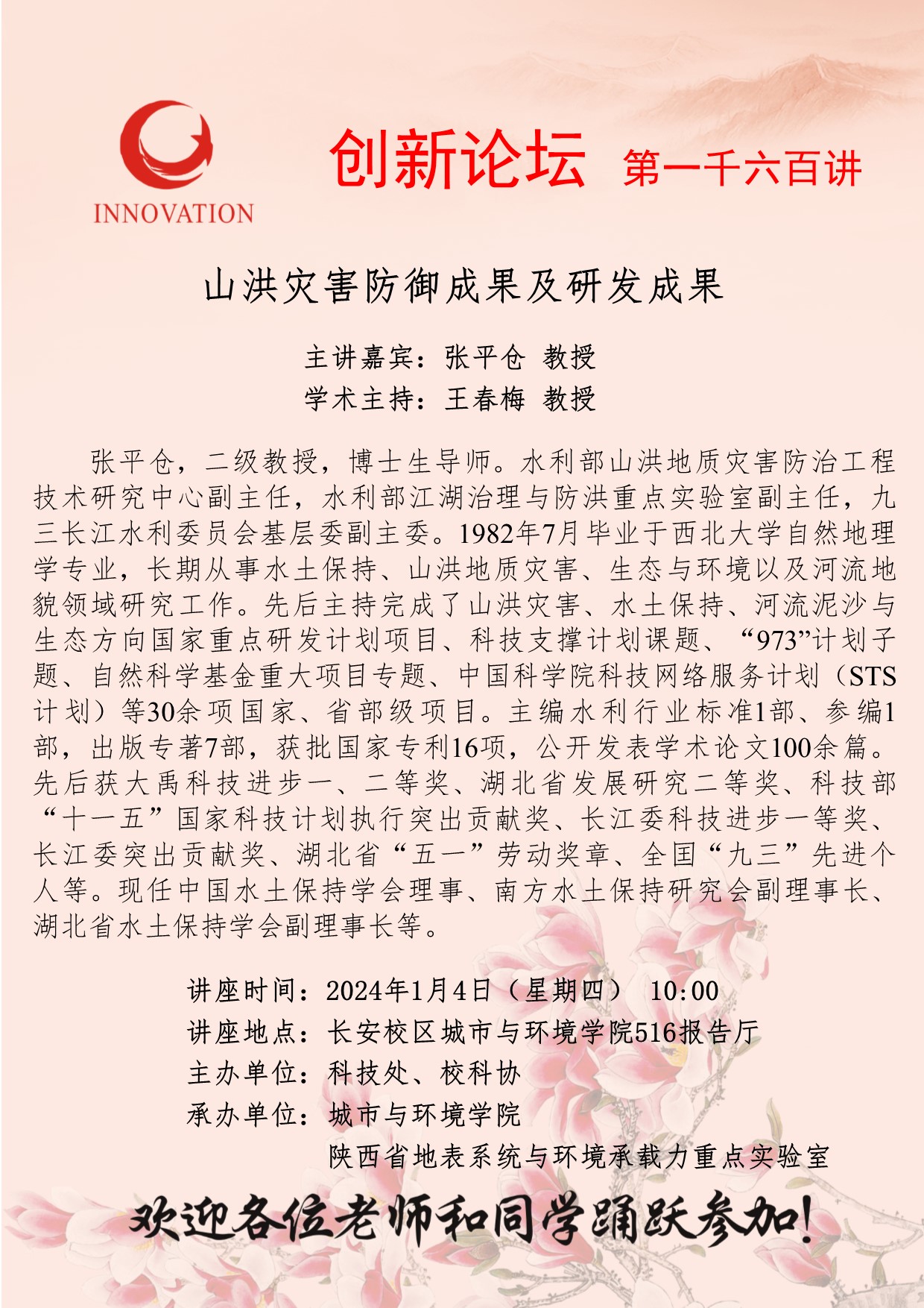 张平仓 教授 8868体育登录创新论坛第一千六百讲:山洪灾害防御成果及研发成果 讲座时间 2024年1月4日(星期四) 10:00 讲座地点 长安校区城市与环境学院516报告厅 讲座人介绍 张平仓 教授 讲座内容