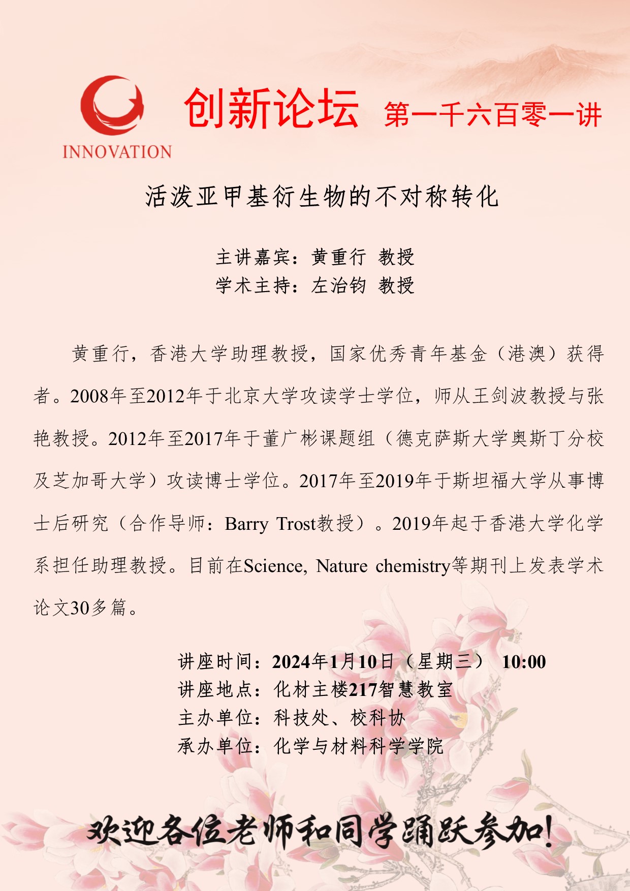 黄重行 教授 8868体育登录创新论坛第一千六百零一讲:活泼亚甲基衍生物的不对称转化 讲座时间 2024年1月10日(星期三) 10:00 讲座地点 化材主楼217智慧教室 讲座人介绍 黄重行 教授 讲座内容
