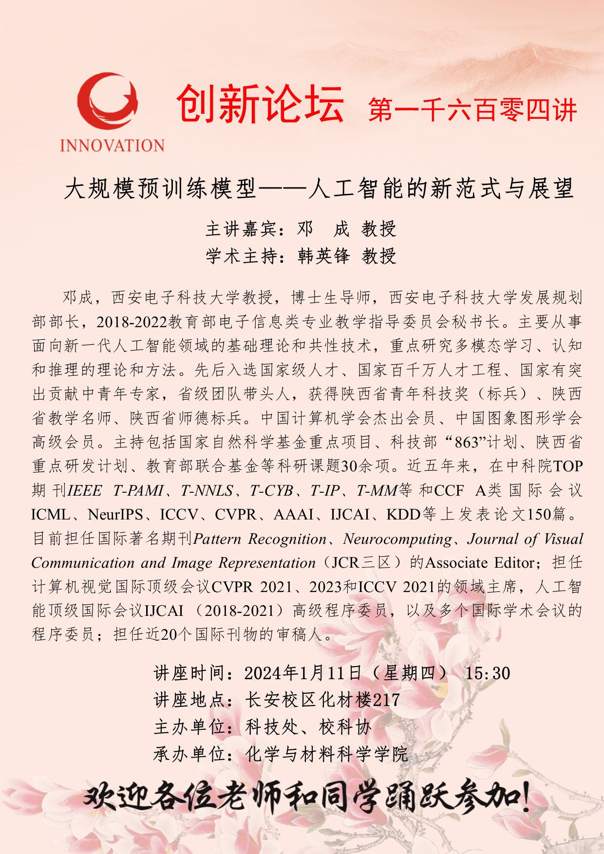 邓成 教授 8868体育登录创新论坛第一千六百零四讲:大规模预训练模型——人工智能的新范式与展望 讲座时间 2024年1月11日(星期四) 15:30 讲座地点 长安校区化材楼217 讲座人介绍 邓成 教授 讲座内容