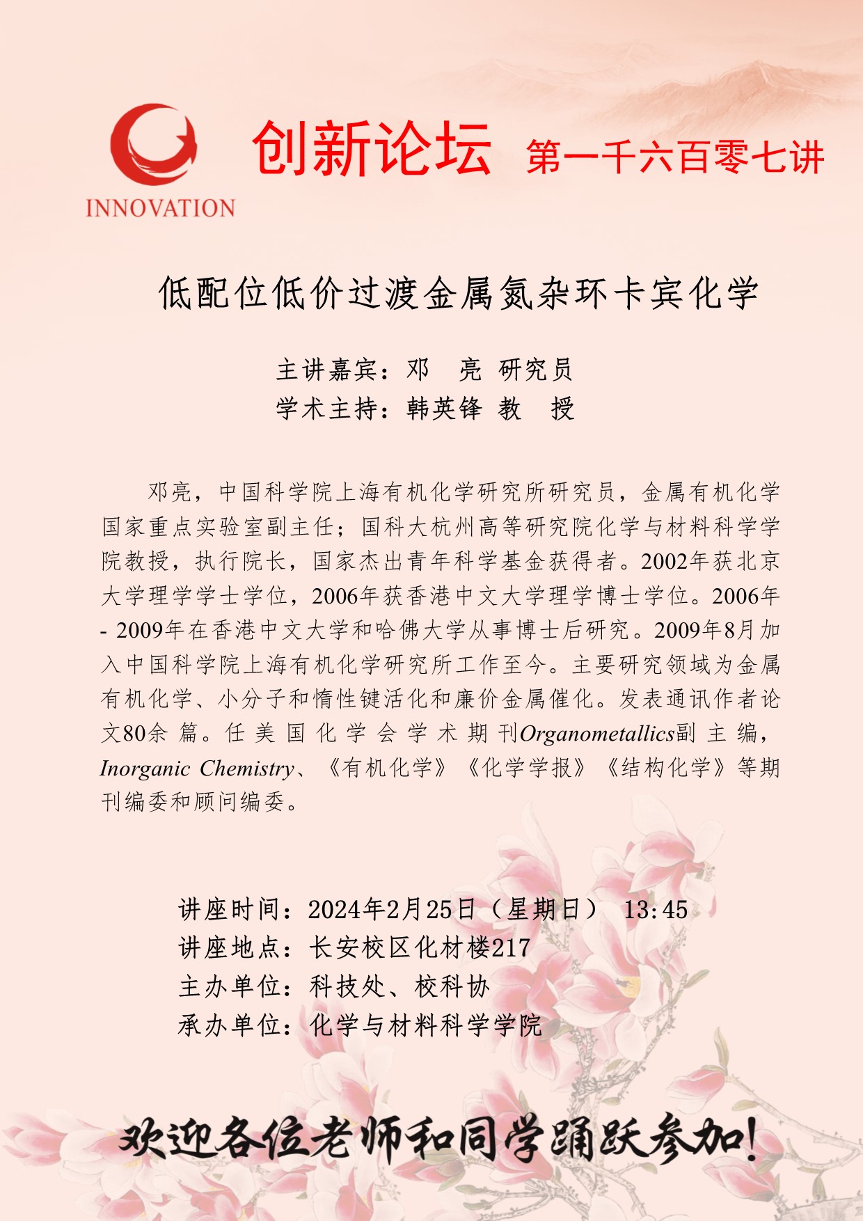 邓亮 研究员 8868体育登录创新论坛第一千六百零七讲: 低配位低价过渡金属氮杂环卡宾化学 讲座时间 2024年2月25日(星期日) 13:45 讲座地点 长安校区化材楼217 讲座人介绍 邓亮 研究员 讲座内容