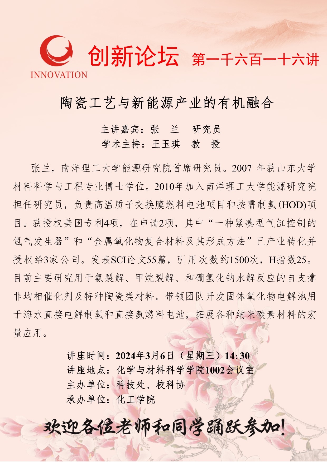 张兰 研究员 8868体育登录创新论坛第一千六百一十六讲:陶瓷工艺与新能源产业的有机融合 讲座时间 2024年3月6日(星期三)14:30 讲座地点 化学与材料科学学院1002会议室 讲座人介绍 张兰 研究员 讲座内容