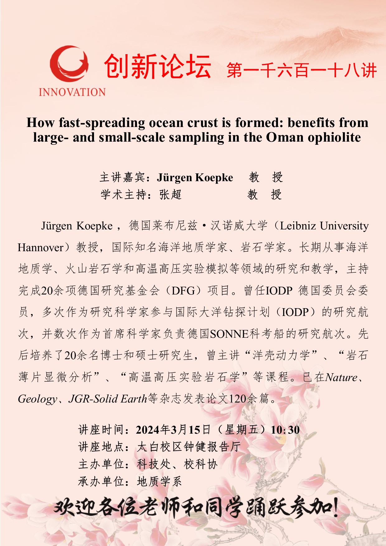 Jürgen Koepke 教 授 8868体育登录创新论坛第一千六百一十八讲:How fast-spreading ocean crust is formed: benefits from large- and small-scale sampling in the Oman ophiolite 讲座时间 2024年3月15日(星期五)10:30 讲座地点 太白校区钟健报告厅 讲座人介绍 Jürgen Koepke 教 授 讲座内容