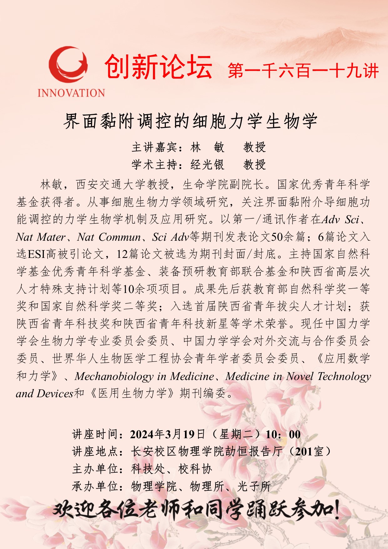 林敏 教授 8868体育登录创新论坛第一千六百一十九讲:界面黏附调控的细胞力学生物学 讲座时间 2024年3月19日(星期二)10:00 讲座地点 长安校区物理学院劼恒报告厅(201室) 讲座人介绍 林敏 教授 讲座内容
