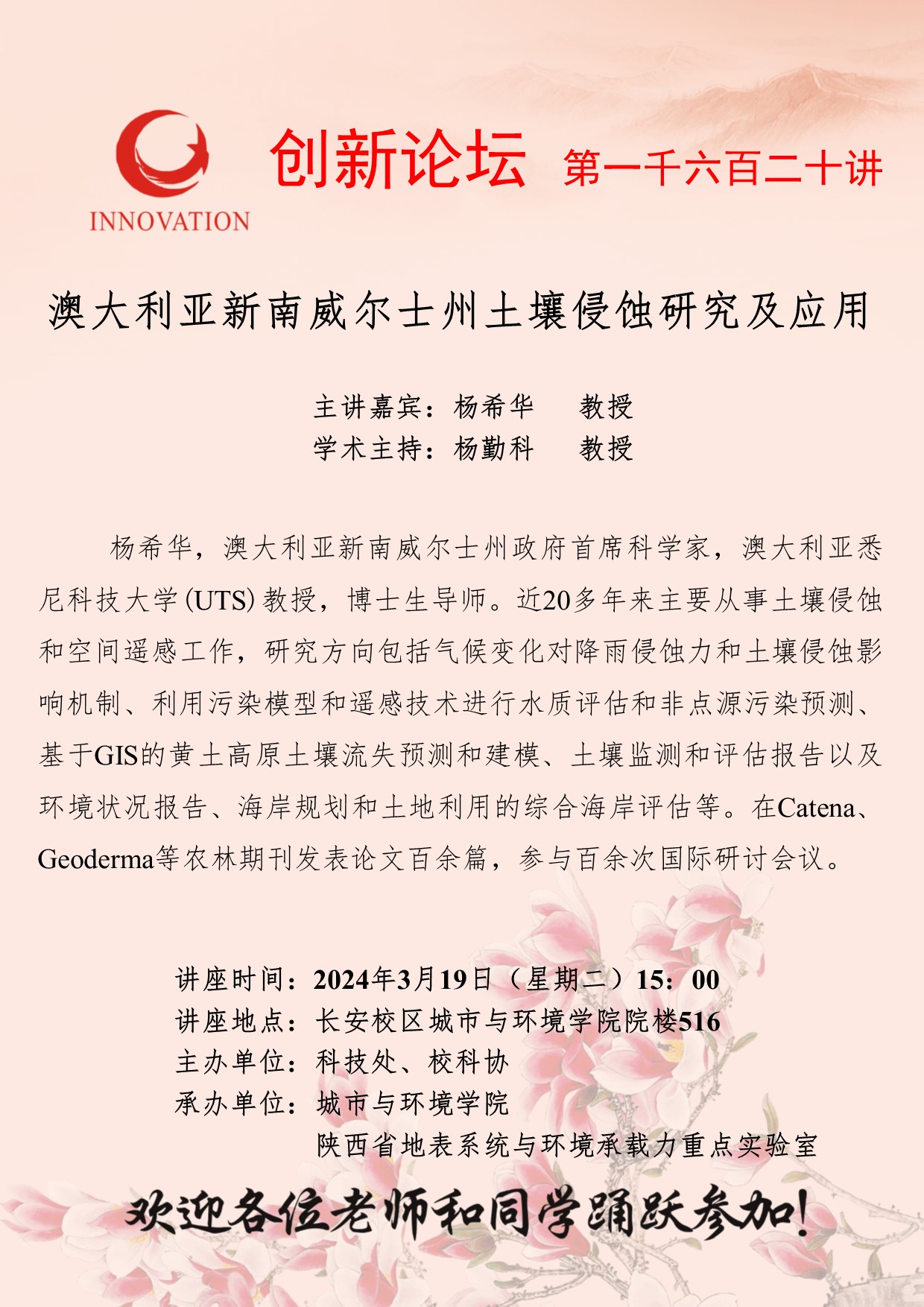 杨希华 教授 8868体育登录创新论坛第一千六百二十讲:澳大利亚新南威尔士州土壤侵蚀研究及应用 讲座时间 2024年3月19日(星期二)15:00 讲座地点 长安校区城市与环境学院院楼516 讲座人介绍 杨希华 教授 讲座内容