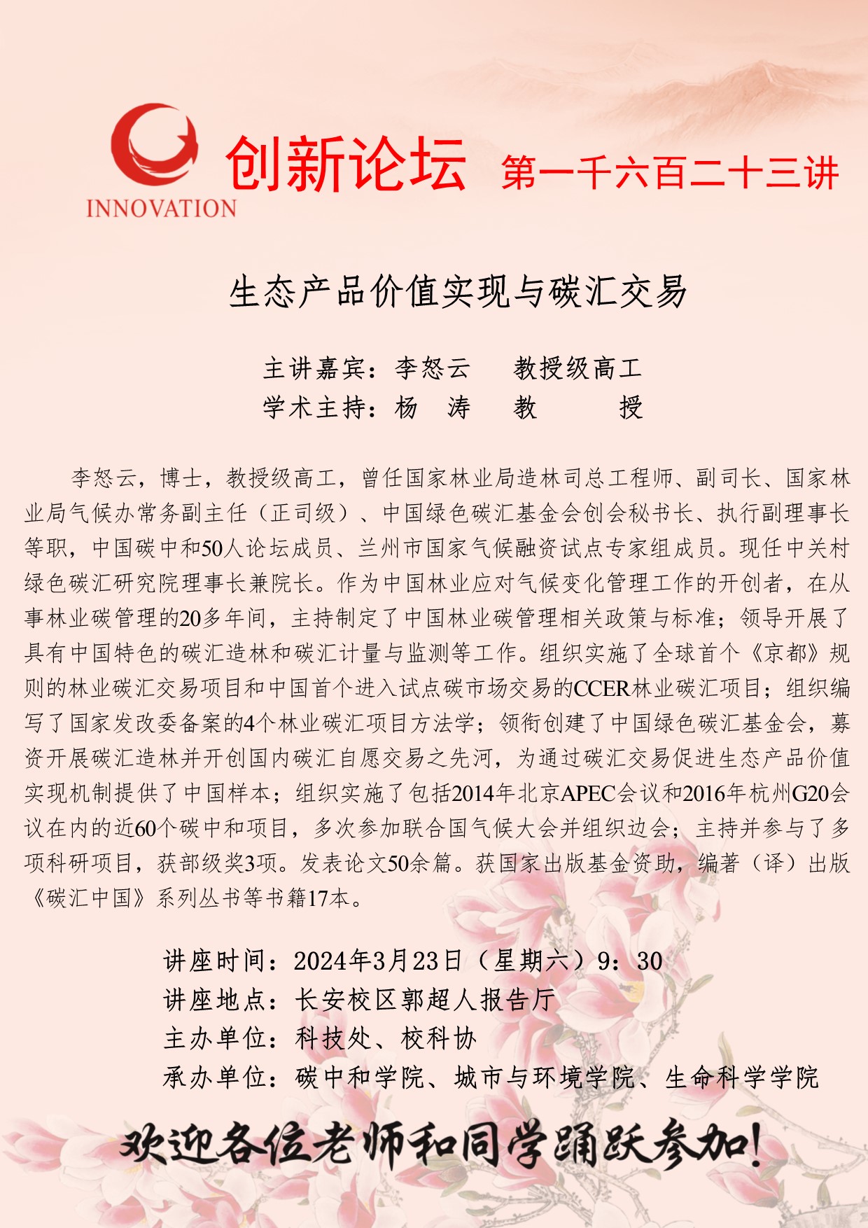 李怒云 教授级高工 8868体育登录创新论坛第一千六百二十三讲:生态产品价值实现与碳汇交易 讲座时间 2024年3月23日(星期六)9:30 讲座地点 长安校区郭超人报告厅 讲座人介绍 李怒云 教授级高工 讲座内容
