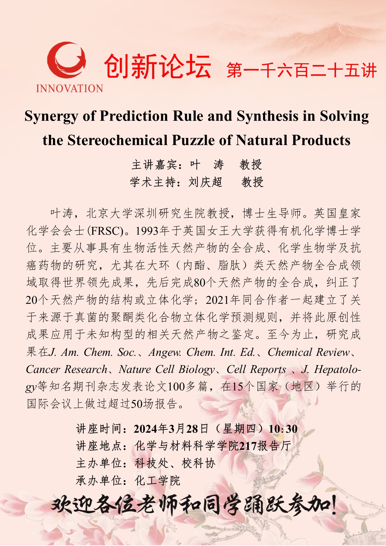 叶涛 教授 8868体育登录创新论坛第一千六百二十五讲:Synergy of Prediction Rule and Synthesis in Solving the Stereochemical Puzzle of Natural Products 讲座时间 2024年3月28日(星期四)10:30 讲座地点 化学与材料科学学院217报告厅 讲座人介绍 叶涛 教授 讲座内容