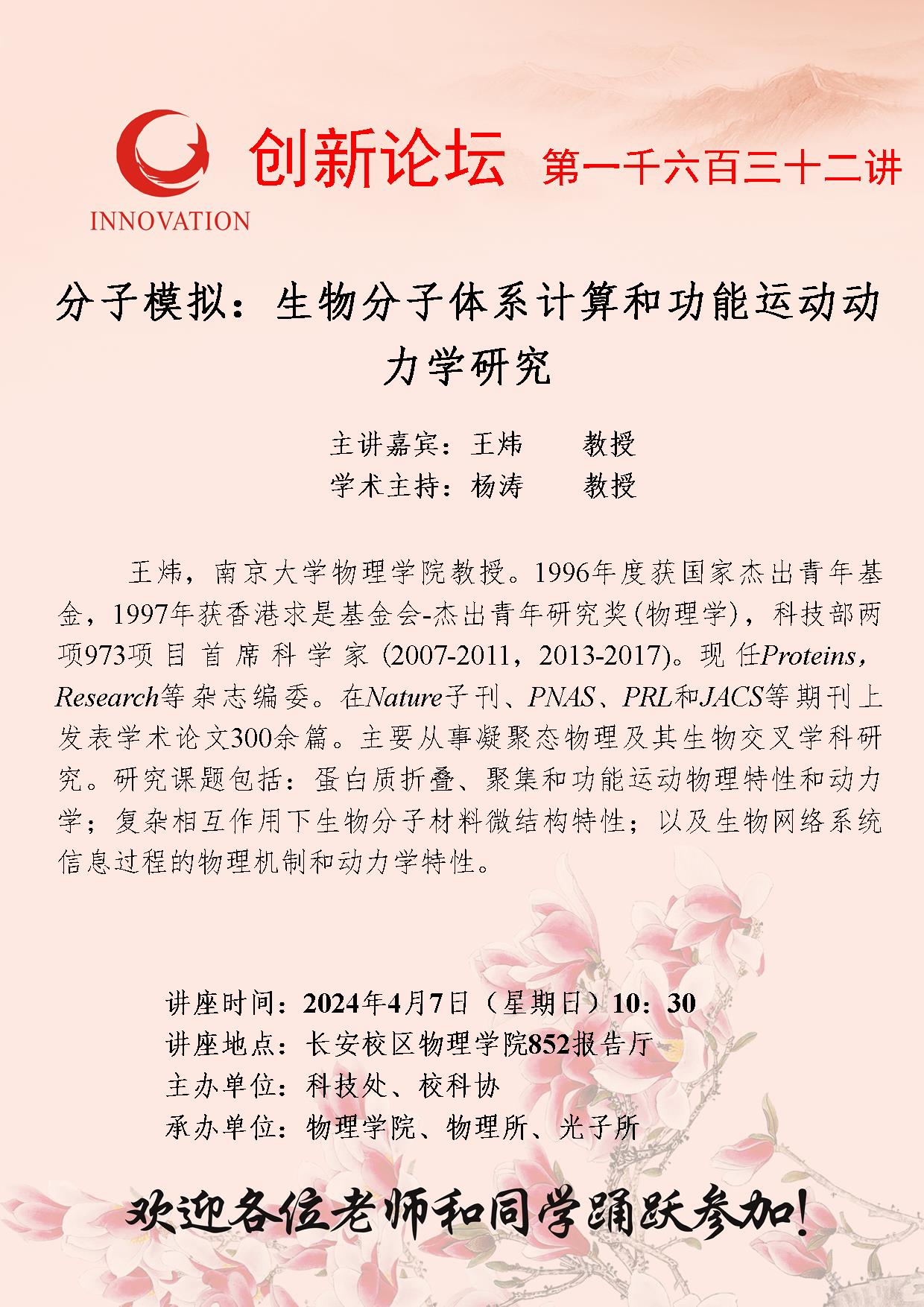 王炜 教授 8868体育登录创新论坛第一千六百三十二讲:分子模拟:生物分子体系计算和功能运动动力学研究 讲座时间 2024年4月7日(星期日)10:30 讲座地点 长安校区物理学院852报告厅 讲座人介绍 王炜 教授 讲座内容
