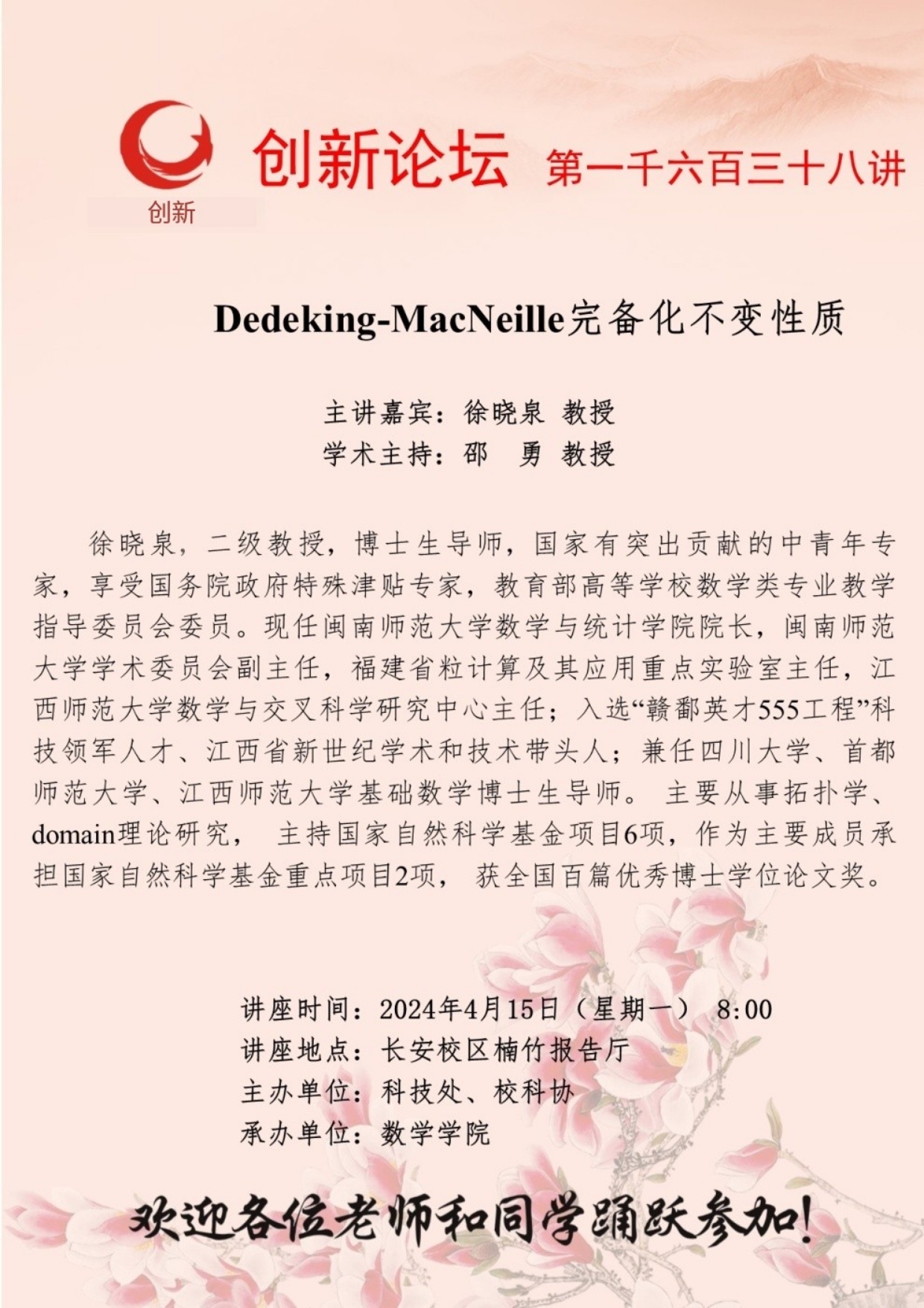 徐晓泉 教授 8868体育登录创新论坛第一千六百三十八讲:Dedeking-MacNeille完备化不变性质 讲座时间 2024年4月15日(星期一) 8:00 讲座地点 长安校区楠竹报告厅 讲座人介绍 徐晓泉 教授 讲座内容