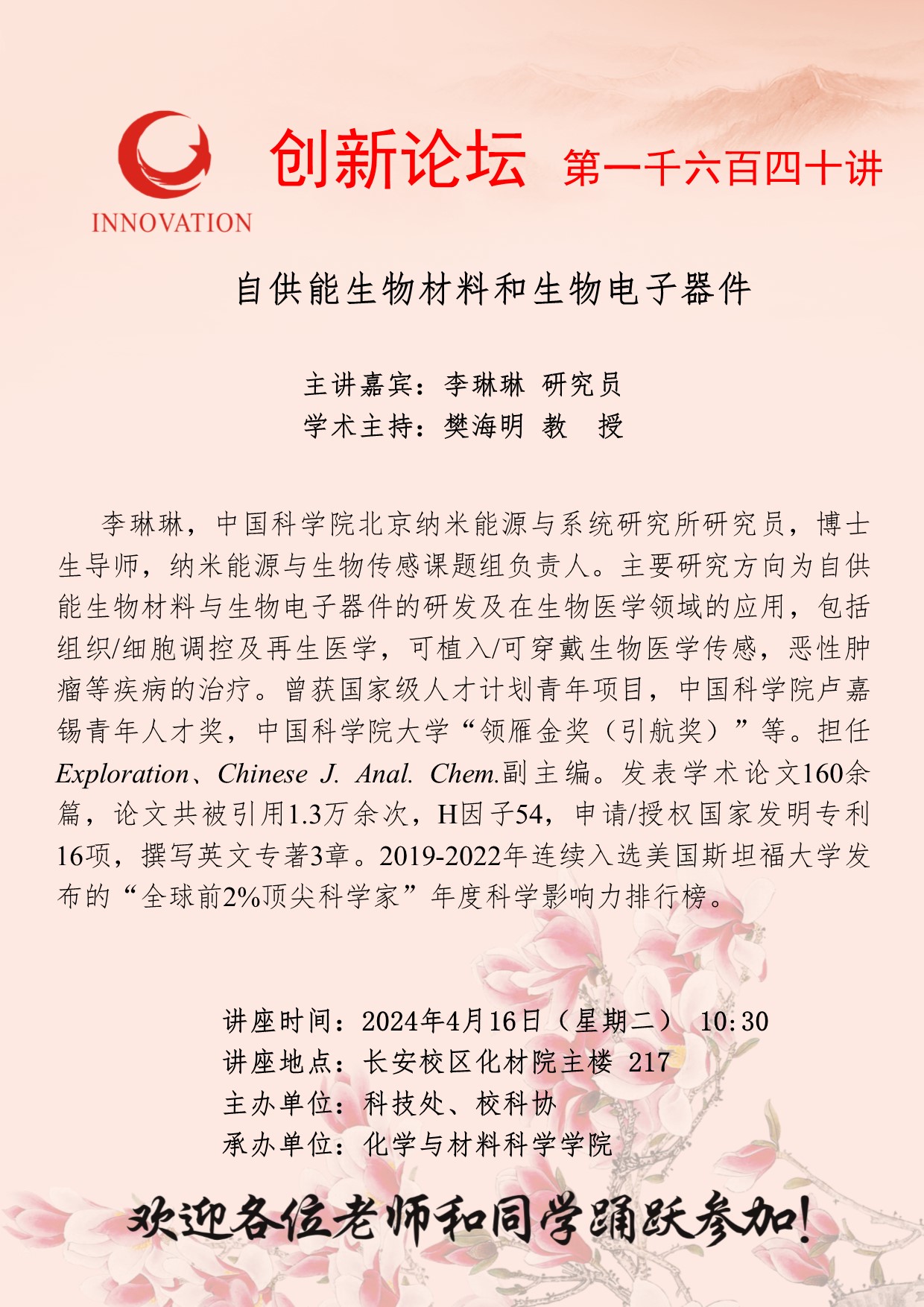 李琳琳 研究员 8868体育登录创新论坛第一千六百四十讲:自供能生物材料和生物电子器件 讲座时间 2024年4月16日(星期二) 10:30 讲座地点 长安校区化材院主楼 217 讲座人介绍 李琳琳 研究员 讲座内容