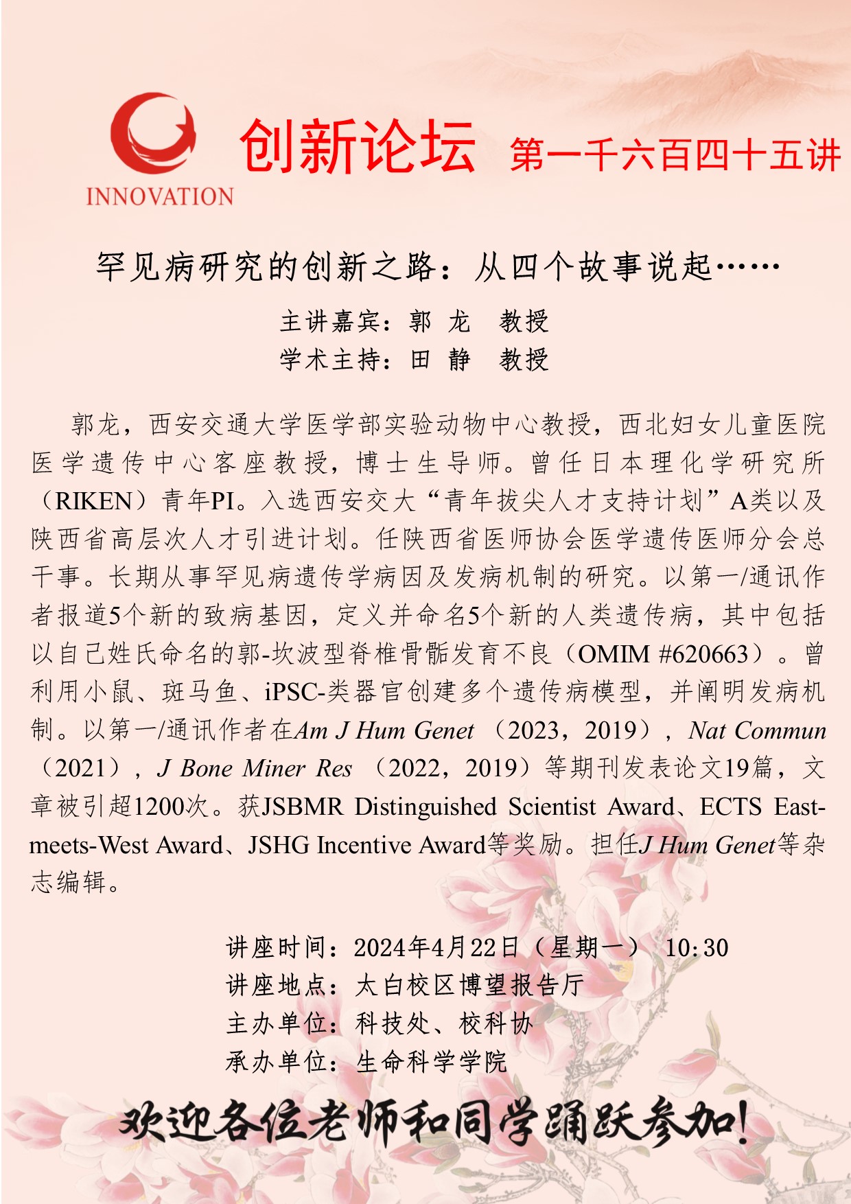 郭龙 教授 8868体育登录创新论坛第一千六百四十五讲:罕见病研究的创新之路:从四个故事说起…… 讲座时间 2024年4月22日(星期一) 10:30 讲座地点 太白校区博望报告厅 讲座人介绍 郭龙 教授 讲座内容