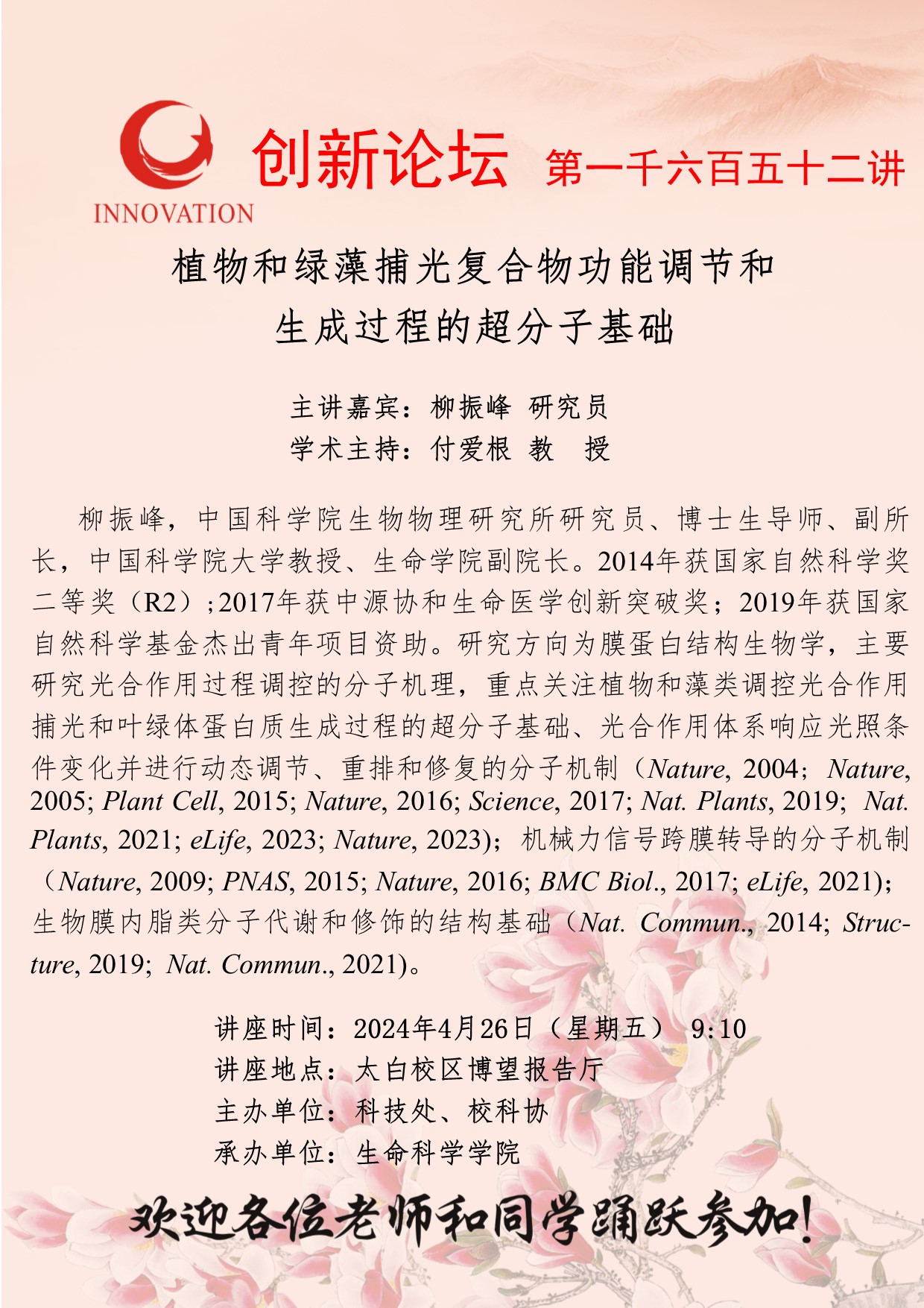柳振峰 研究员 8868体育登录创新论坛第一千六百五十二讲:植物和绿藻捕光复合物功能调节和生成过程的超分子基础 讲座时间 2024年4月26日(星期五) 9:10 讲座地点 太白校区博望报告厅 讲座人介绍 柳振峰 研究员 讲座内容
