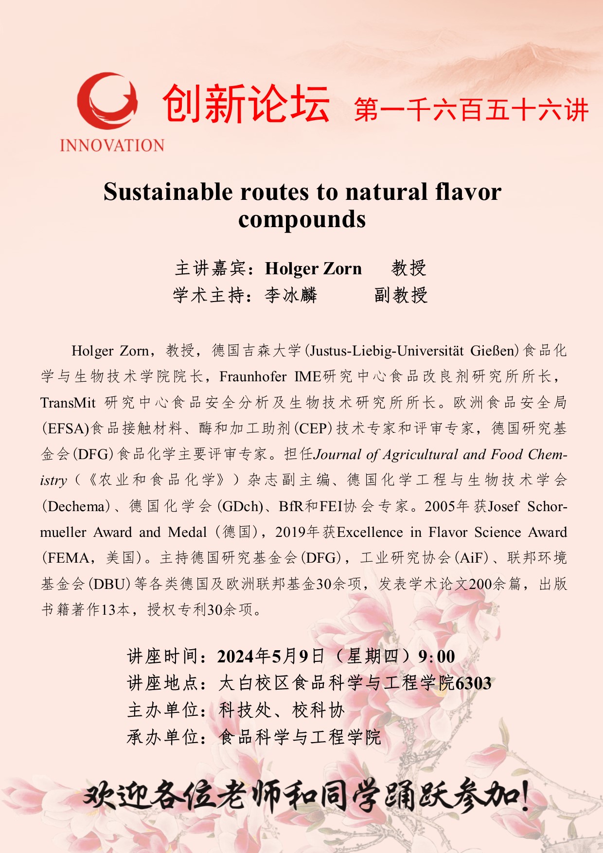 Holger Zorn 教授 8868体育登录创新论坛第一千六百五十六讲:Sustainable routes to natural flavor compounds 讲座时间 2024年5月9日(星期四)9:00 讲座地点 太白校区食品科学与工程学院6303 讲座人介绍 Holger Zorn 教授 讲座内容