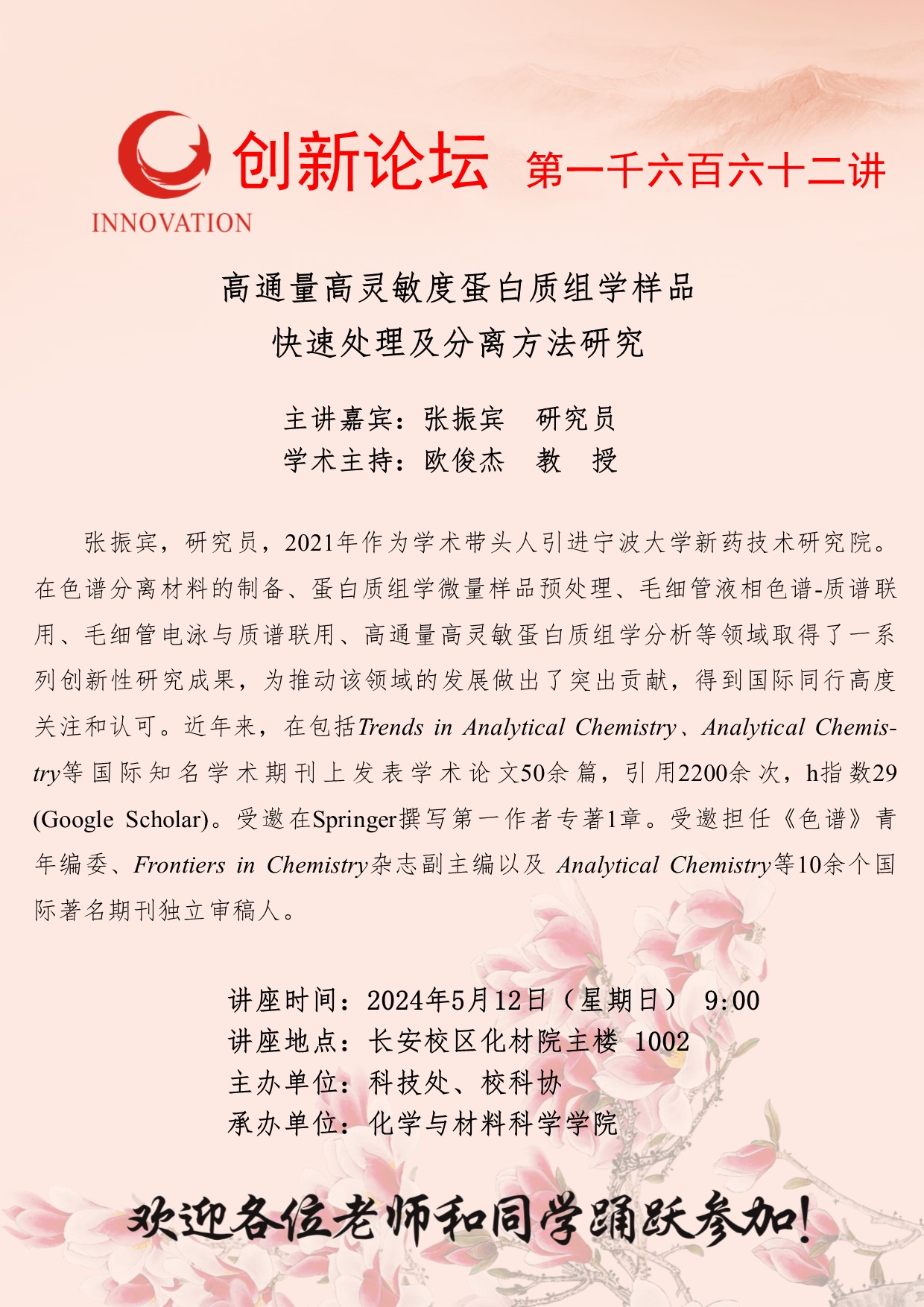 张振宾 研究员 8868体育登录创新论坛第一千六百六十二讲:高通量高灵敏度蛋白质组学样品快速处理及分离方法研究 讲座时间 2024年5月12日(星期日) 9:00 讲座地点 长安校区化材院主楼 讲座人介绍 张振宾 研究员 讲座内容