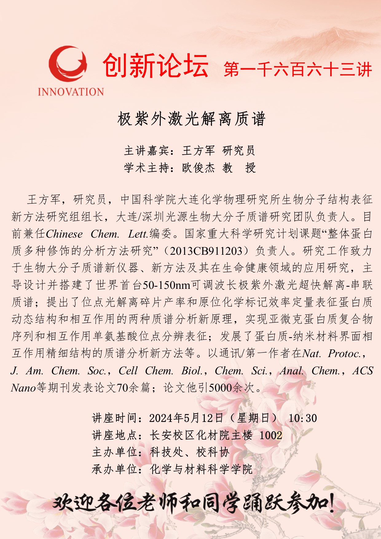 王方军 研究员 8868体育登录创新论坛第一千六百六十三讲:极紫外激光解离质谱 讲座时间 2024年5月12日(星期日) 10:30 讲座地点 长安校区化材院主楼 1002 讲座人介绍 王方军 研究员 讲座内容