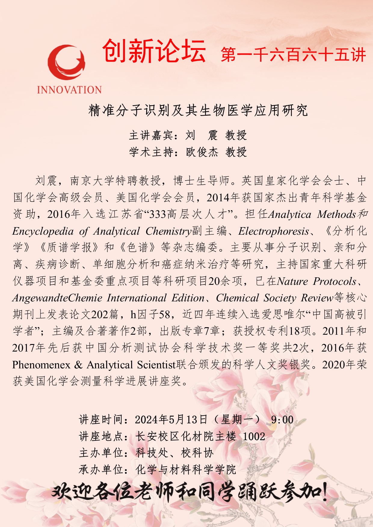 刘 震 教授 8868体育登录创新论坛第一千六百六十五讲:精准分子识别及其生物医学应用研究 讲座时间 2024年5月13日(星期一) 9:00 讲座地点 长安校区化材院主楼 1002 室 讲座人介绍 刘 震 教授 讲座内容