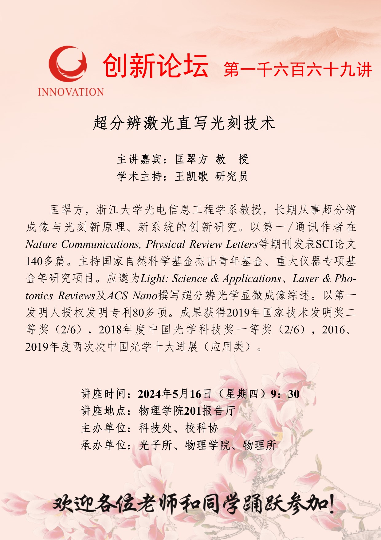 匡翠方 教 授 8868体育登录创新论坛第一千六百六十九讲:超分辨激光直写光刻技术 讲座时间 2024年5月16日(星期四)9:30 讲座地点 物理学院201报告厅 讲座人介绍 匡翠方 教 授 讲座内容