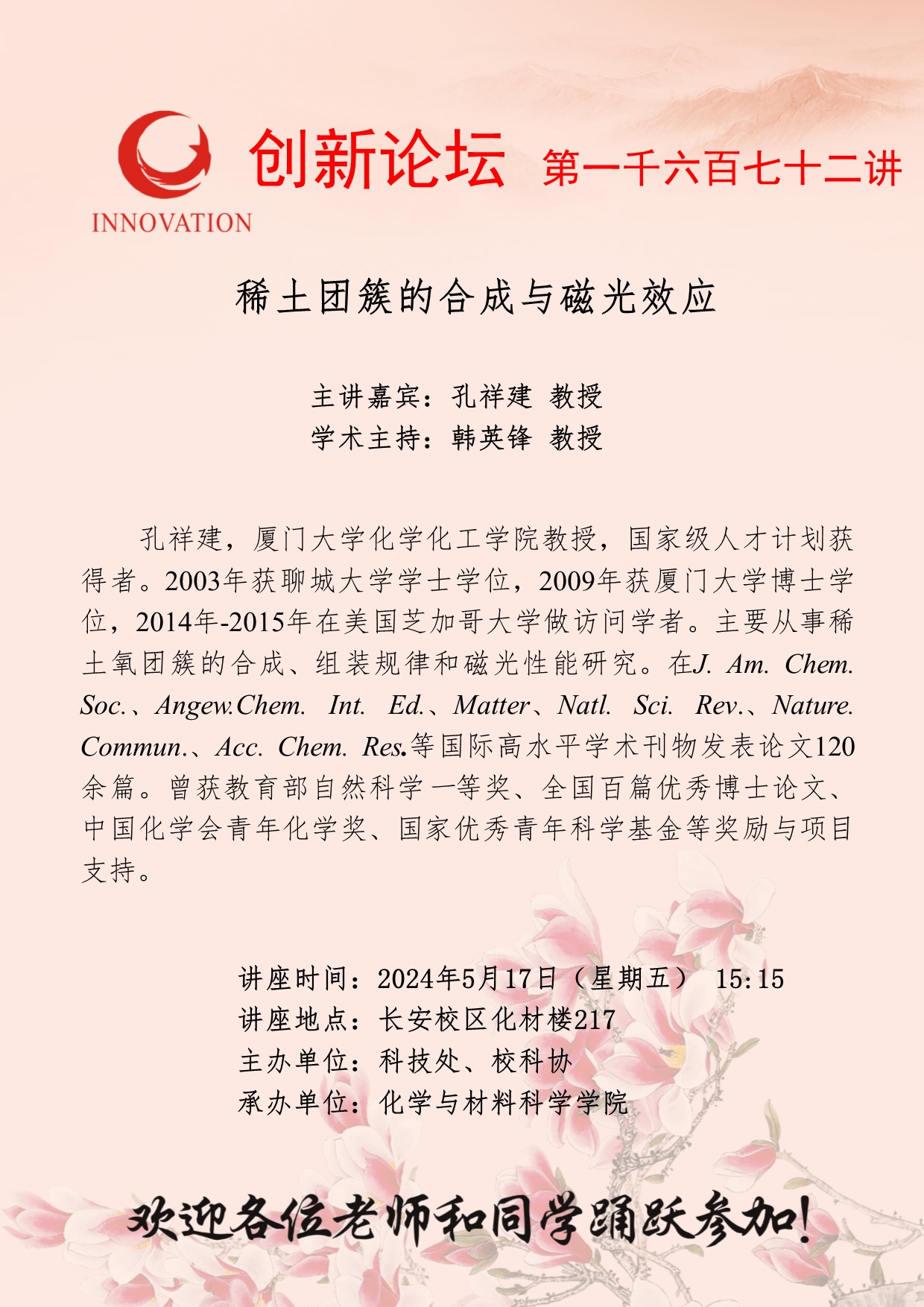 孔祥建 教授 8868体育登录创新论坛第一千六百七十二讲:稀土团簇的合成与磁光效应 讲座时间 2024年5月17日(星期五) 15:15 讲座地点 长安校区化材楼217 讲座人介绍 孔祥建 教授 讲座内容