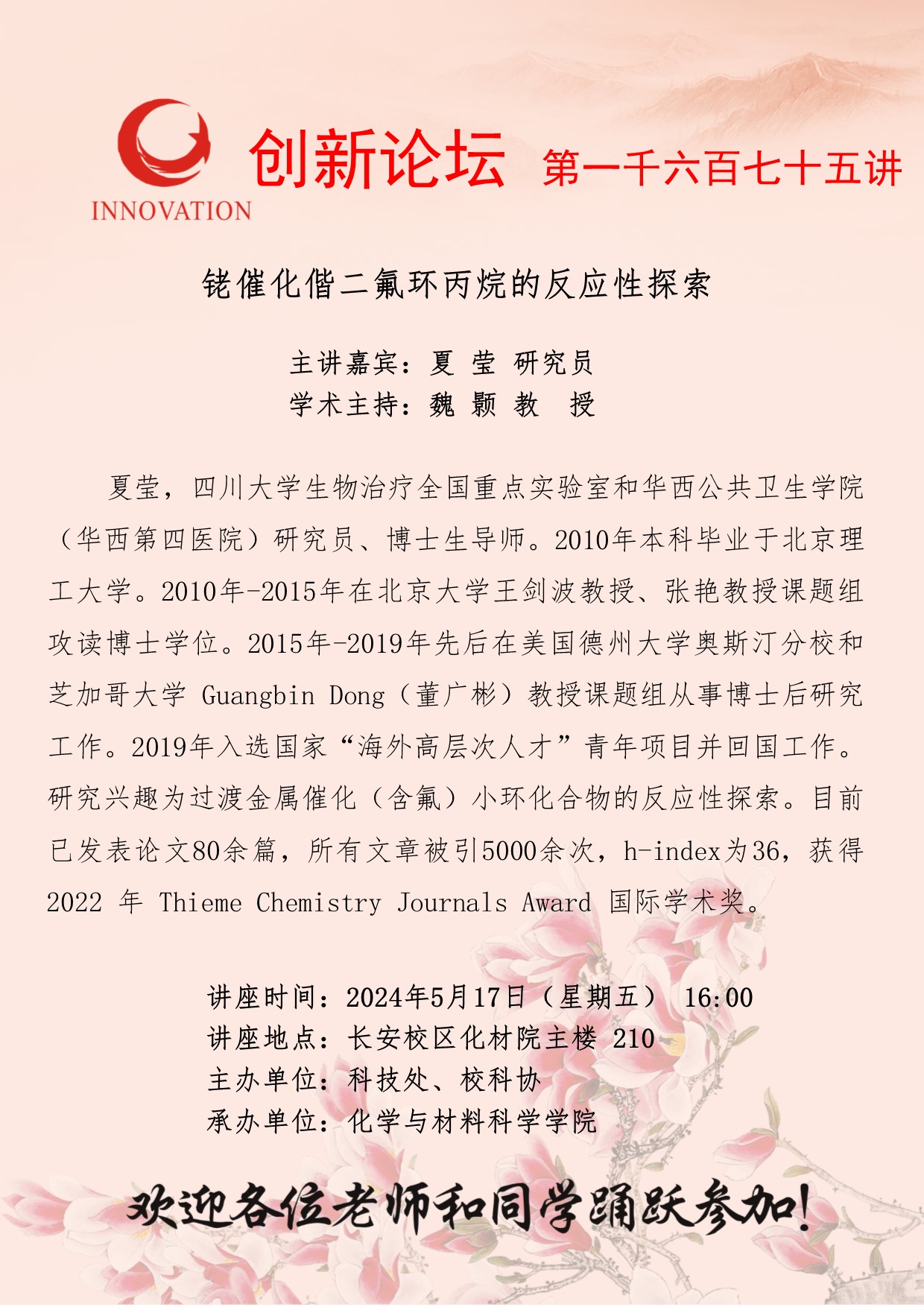 夏莹 研究员 8868体育登录创新论坛第一千六百七十五讲:铑催化偕二氟环丙烷的反应性探索 讲座时间 2024年5月17日(星期五) 16:00 讲座地点 长安校区化材院主楼 210 讲座人介绍 夏莹 研究员 讲座内容