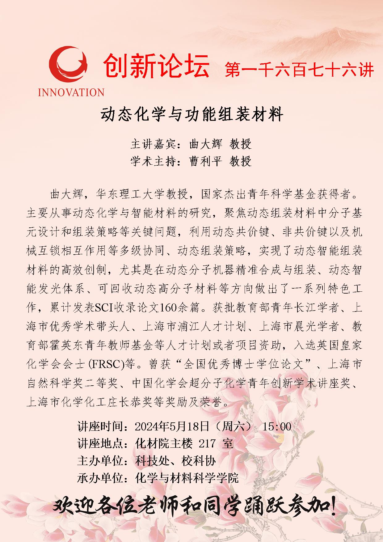 曲大辉 教授 8868体育登录创新论坛第一千六百七十六讲:动态化学与功能组装材料 讲座时间 2024年5月18日(星期六) 15:00 讲座地点 长安校区化材主楼 217 室 讲座人介绍 曲大辉 教授 讲座内容