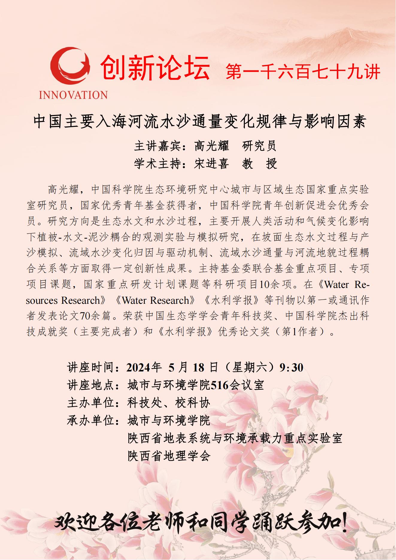 高光耀 研究员 8868体育登录创新论坛第一千六百七十九讲:中国主要入海河流水沙通量变化规律与影响因素 讲座时间 2024年5月18日(星期六)9:30 讲座地点 城市与环境学院516会议室 讲座人介绍 高光耀 研究员 讲座内容