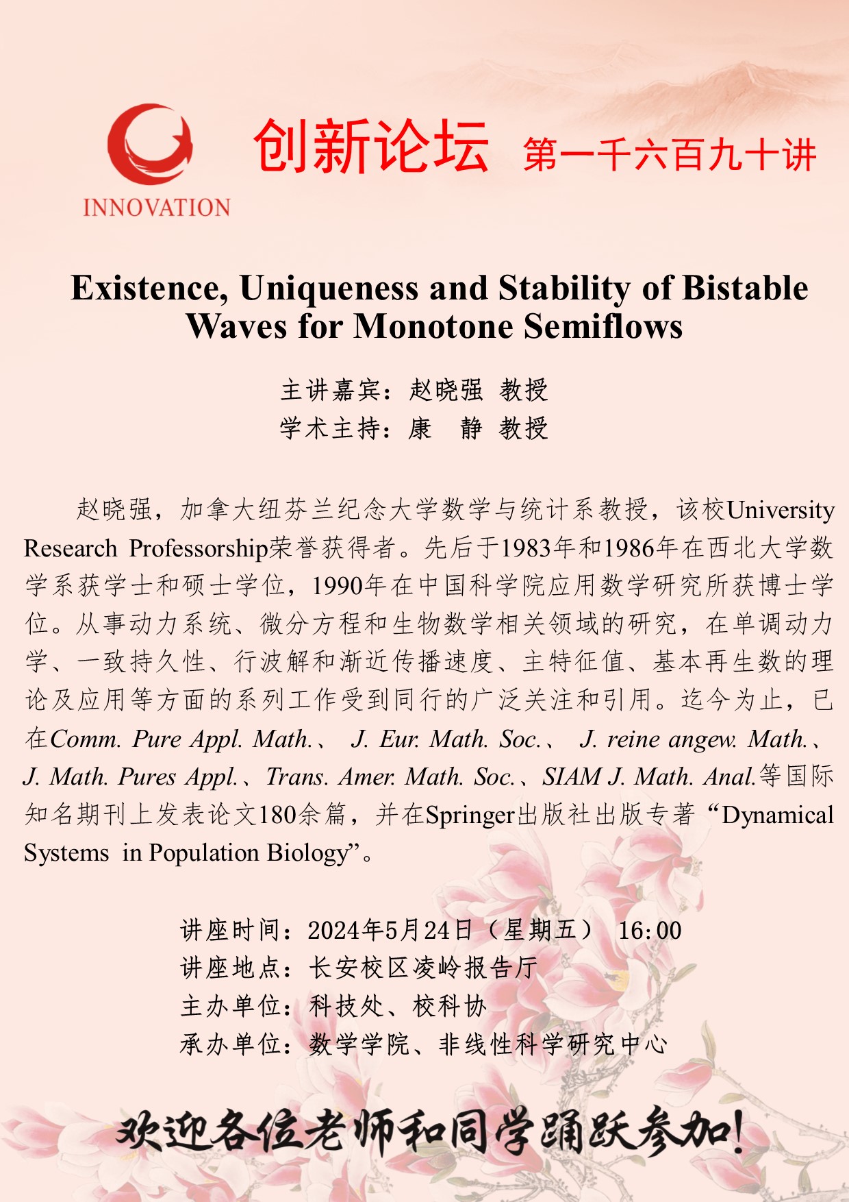 赵晓强 教授 8868体育登录创新论坛第一千六百九十讲:Existence, Uniqueness and Stability of Bistable Waves for Monotone Semiflows 讲座时间 2024年5月24日(星期五) 16:00 讲座地点 长安校区凌岭报告厅 讲座人介绍 赵晓强 教授 讲座内容