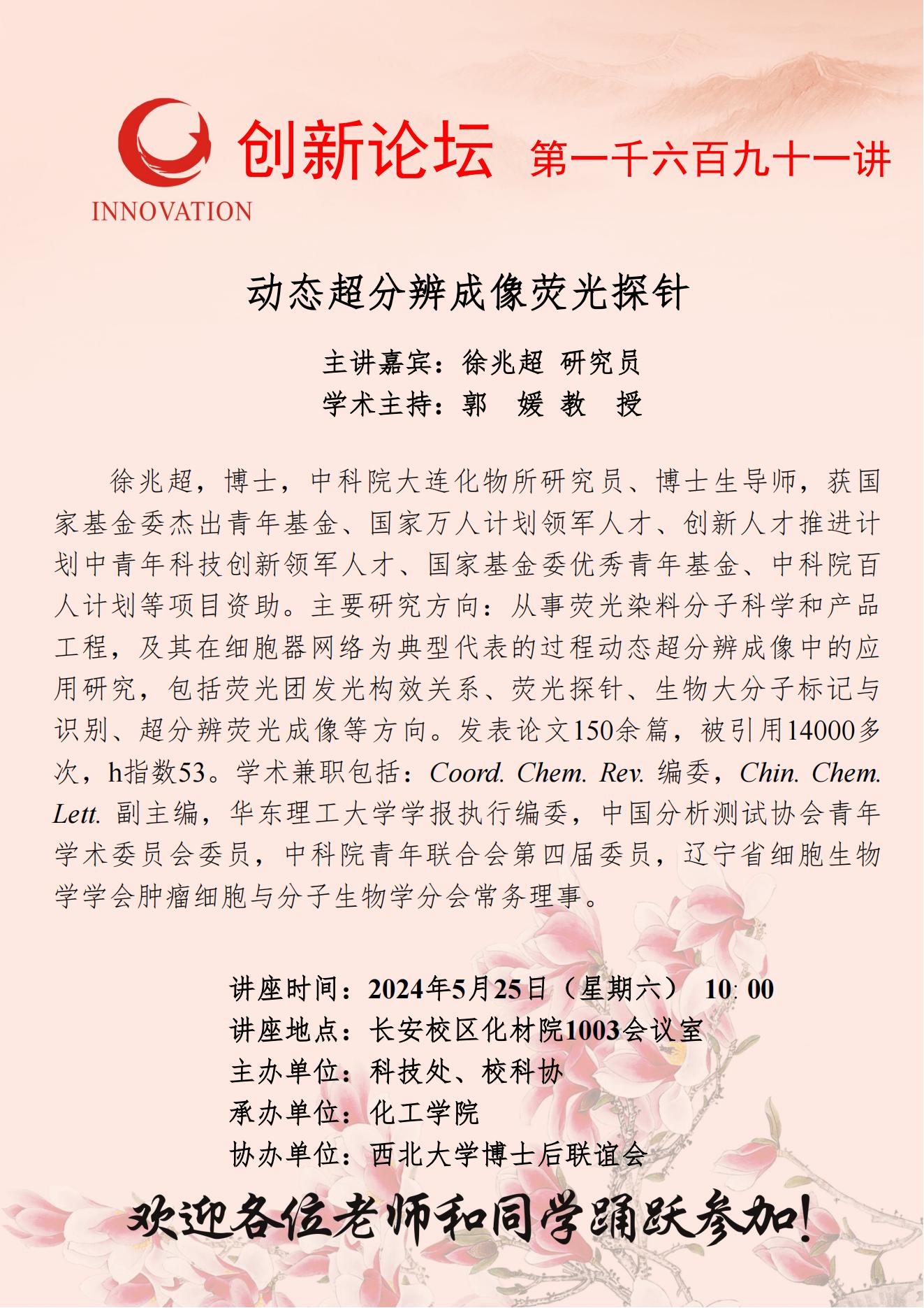 徐兆超 研究员 8868体育登录创新论坛第一千六百九十一讲:动态超分辨成像荧光探针 讲座时间 2024年5月25日(星期六) 10: 00 讲座地点 长安校区化材院1003会议室 讲座人介绍 徐兆超 研究员 讲座内容
