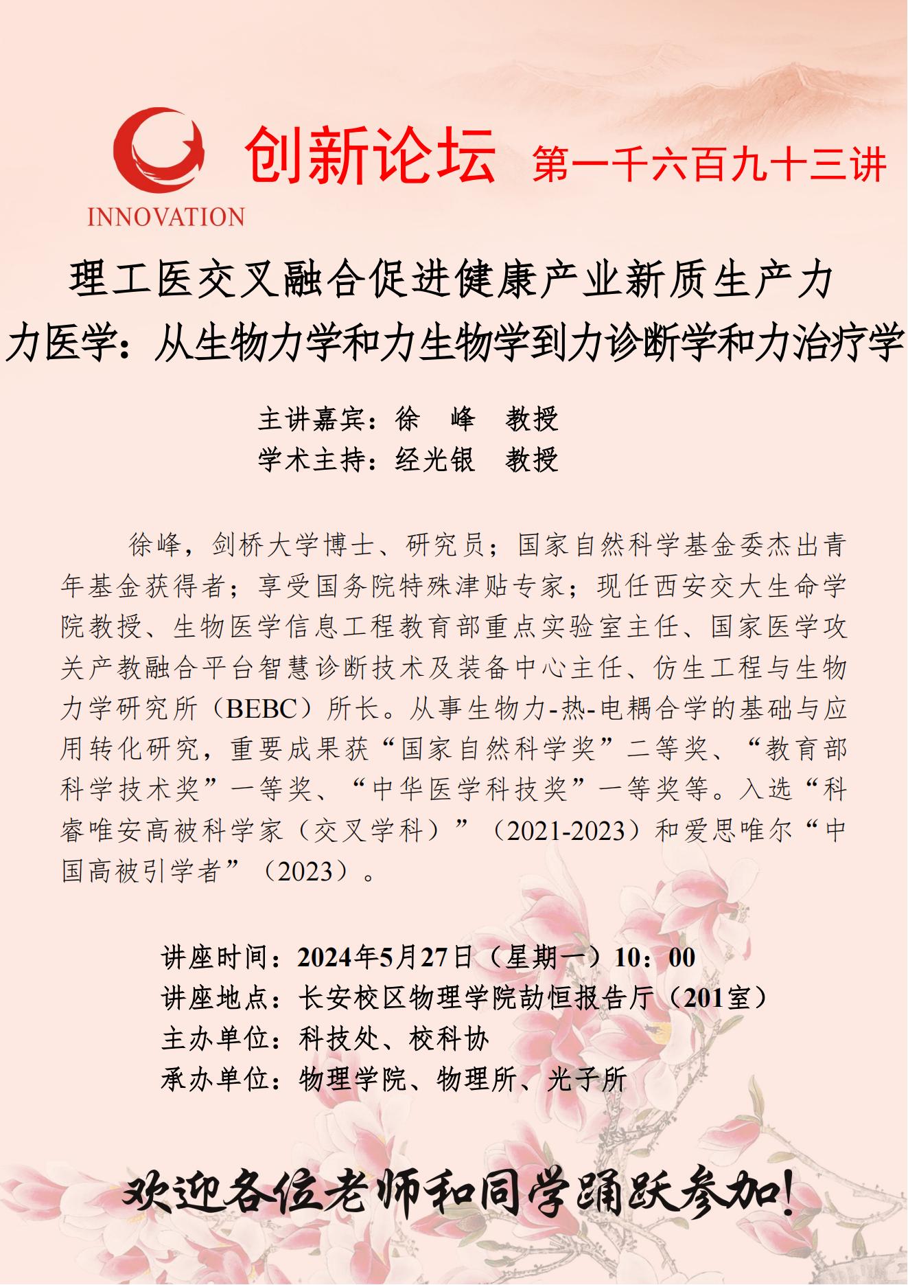 徐峰 教授 8868体育登录创新论坛第一千六百九十三讲:理工医交叉融合促进健康产业新质生产力——力医学:从生物力学和力生物学到力诊断学和力治疗学 讲座时间 2024年5月27日(星期一)10:00 讲座地点 长安校区物理学院劼恒报告厅(201室) 讲座人介绍 徐峰 教授 讲座内容