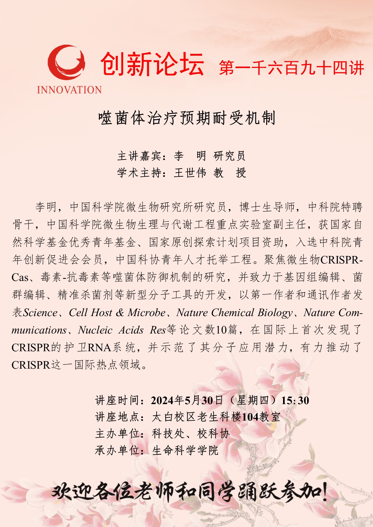 李明 研究员 8868体育登录创新论坛第一千六百九十四讲:噬菌体治疗预期耐受机制 讲座时间 2024年5月30日(星期四)15:30 讲座地点 太白校区老生科楼104教室 讲座人介绍 李明 研究员 讲座内容