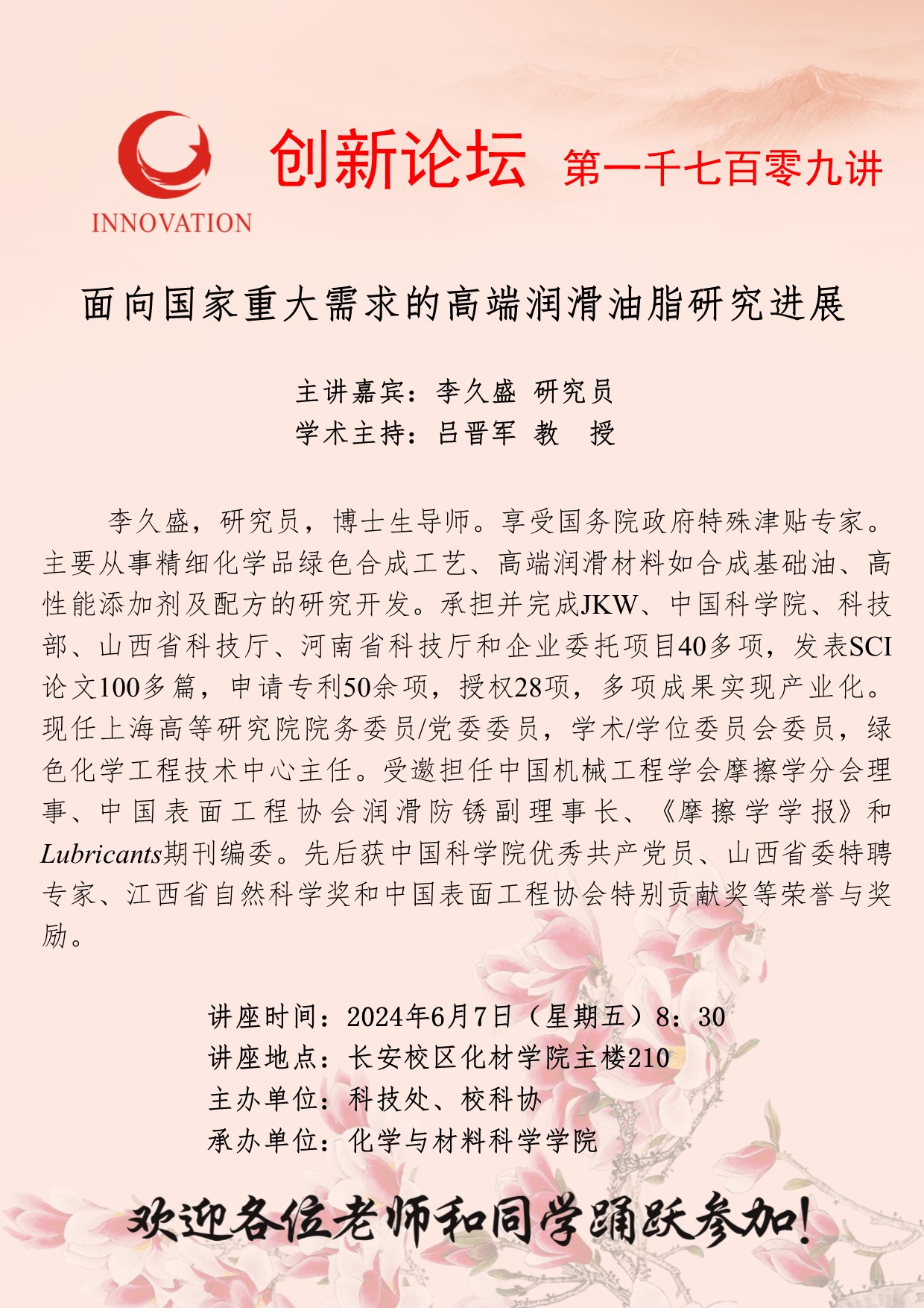 李久盛 研究员 8868体育登录创新论坛第一千七百零九讲:面向国家重大需求的高端润滑油脂研究进展 讲座时间 2024年6月7日(星期五)8:30 讲座地点 长安校区化材学院主楼210 讲座人介绍 李久盛 研究员 讲座内容
