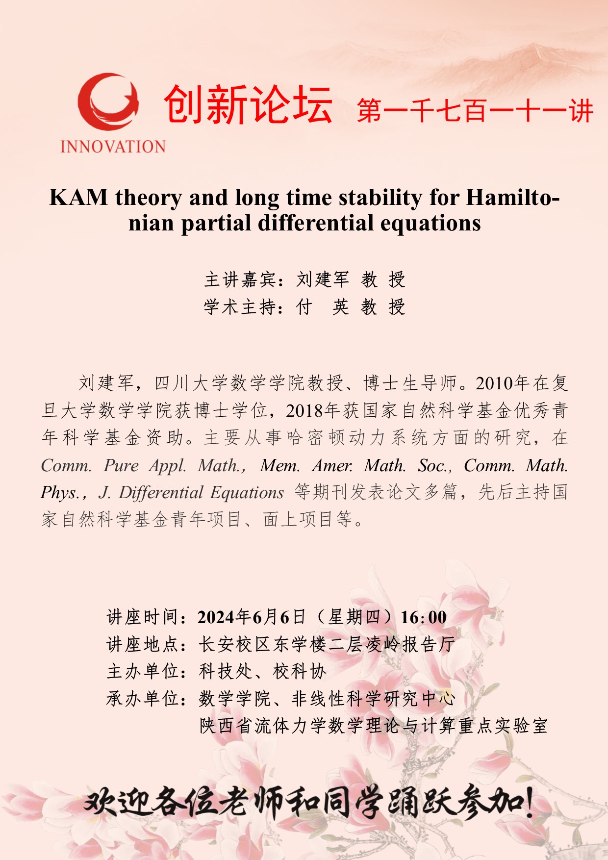 刘建军 教授 8868体育登录创新论坛第一千七百一十一讲:KAM theory and long time stability for Hamiltonian partial differential equations 讲座时间 2024年6月6日(星期四)16:00 讲座地点 长安校区东学楼二层凌岭报告厅 讲座人介绍 刘建军 教授 讲座内容