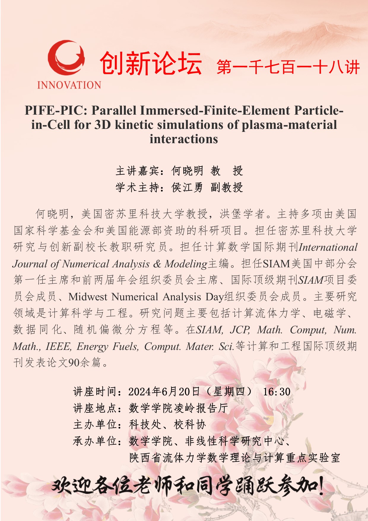 何晓明 教授 8868体育登录创新论坛第一千七百一十八讲:PIFE-PIC: Parallel Immersed-Finite-Element Particle-in-Cell for 3D kinetic simulations of plasma-material interactions 讲座时间 2024年6月20日(星期四) 16:30 讲座地点 数学学院凌岭报告厅 讲座人介绍 何晓明 教授 讲座内容