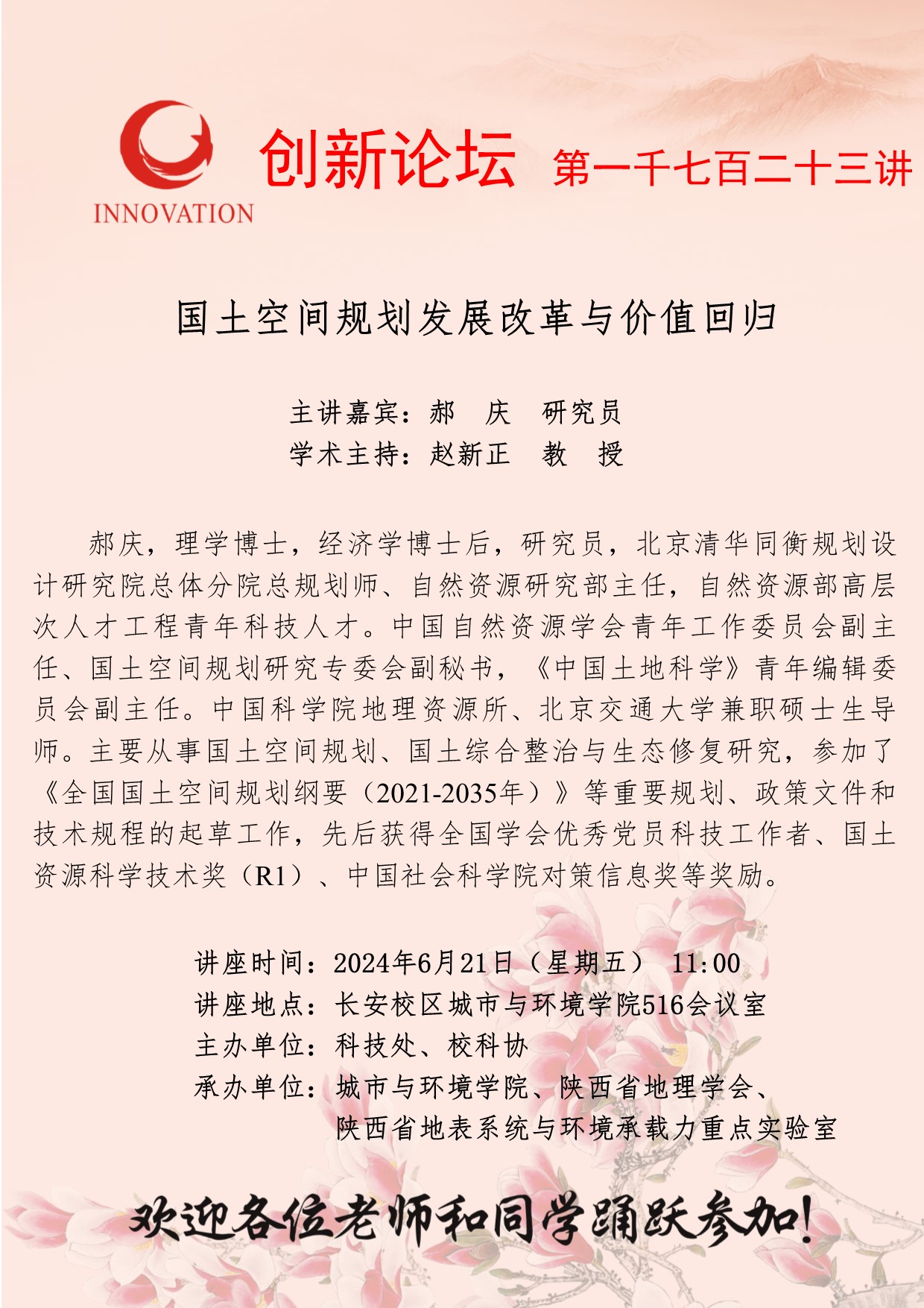 郝庆 研究员 8868体育登录创新论坛第一千七百二十三讲:国土空间规划发展改革与价值回归 讲座时间 2024年6月21日(星期五) 11:00 讲座地点 长安校区城市与环境学院516会议室 讲座人介绍 郝庆 研究员 讲座内容