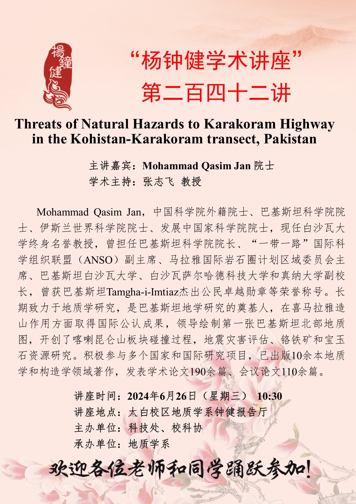 “杨钟健学术讲座”第二百四十二讲:Threats of Natural Hazards to Karakoram Highway in the Kohistan-Karakoram transect, Pakistan