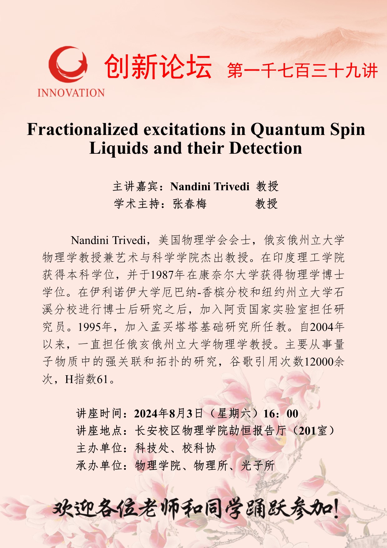 Nandini Trivedi 教授 8868体育登录创新论坛第一千七百三十九讲:Fractionalized excitations in Quantum Spin Liquids and their Detection 讲座时间 2024年8月3日(星期六)16:00 讲座地点 长安校区物理学院劼恒报告厅(201室) 讲座人介绍 Nandini Trivedi 教授 讲座内容