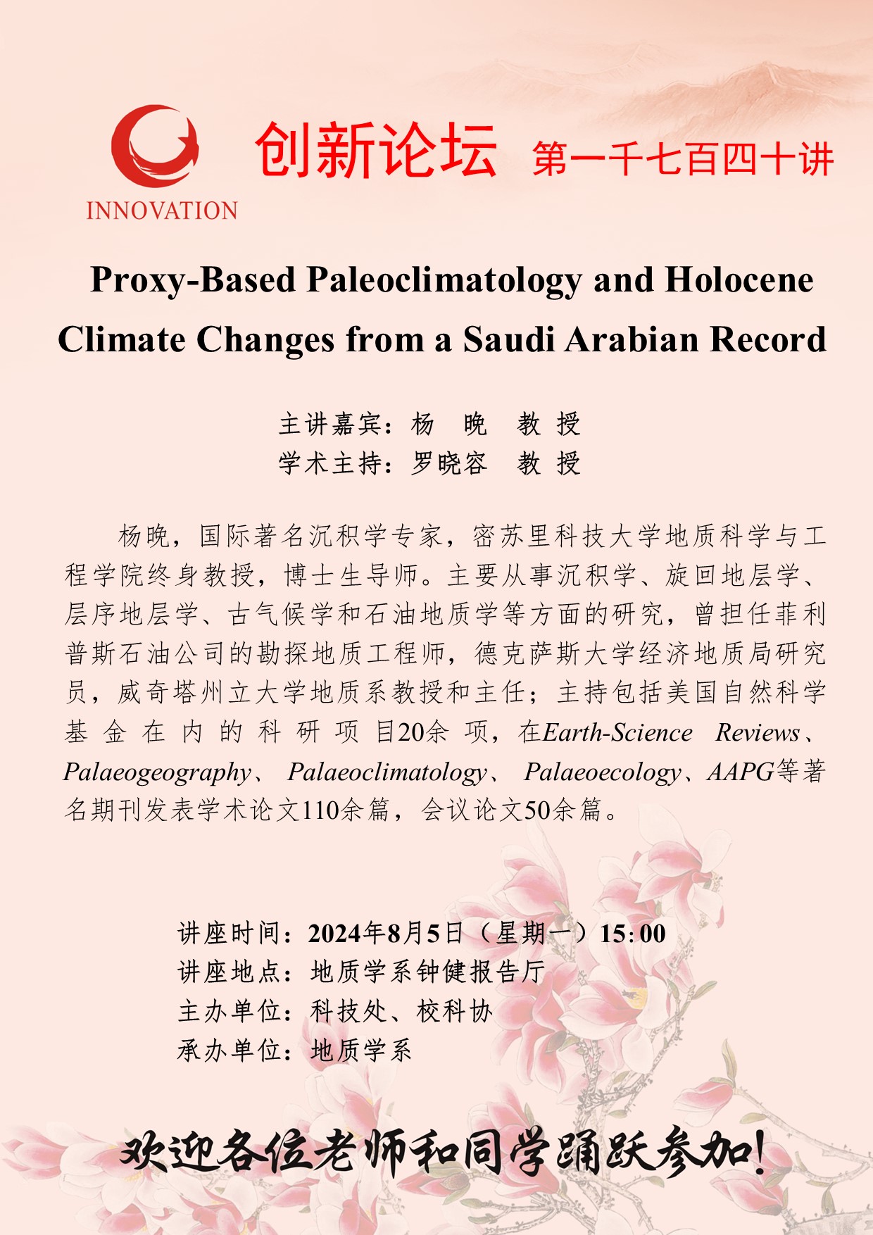 杨晚 教授 8868体育登录创新论坛第一千七百四十讲: Proxy-Based Paleoclimatology and Holocene Climate Changes from a Saudi Arabian Record 讲座时间 2024年8月5日(星期一)15:00 讲座地点 地质学系钟健报告厅 讲座人介绍 杨晚 教授 讲座内容