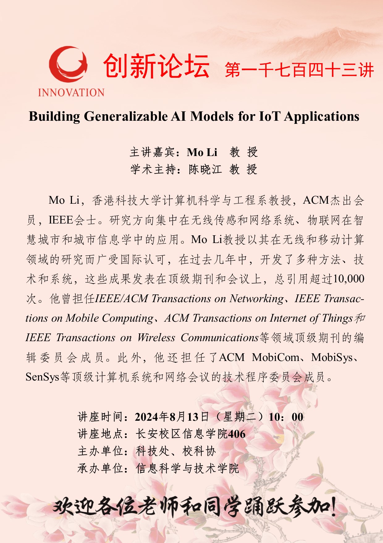 Mo Li 教授 8868体育登录创新论坛第一千七百四十三讲:Building Generalizable AI Models for IoT Applications 讲座时间 2024年8月13日(星期二)10:00 讲座地点 长安校区信息学院406 讲座人介绍 Mo Li 教授 讲座内容
