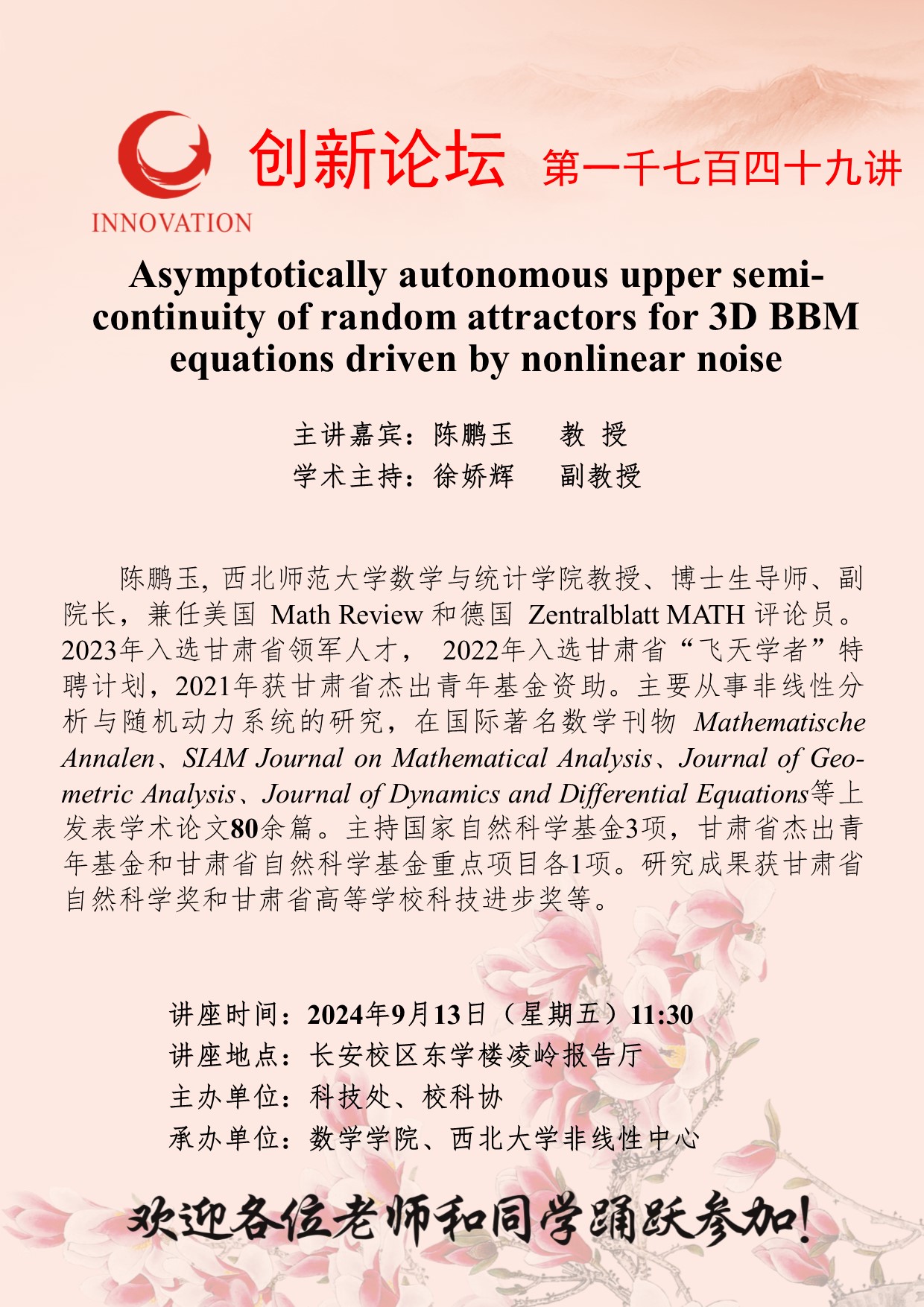 陈鹏玉 教授 8868体育登录创新论坛第一千七百四十九讲:Asymptotically autonomous upper semi-continuity of random attractors for 3D BBM equations driven by nonlinear noise 讲座时间 2024年9月13日(星期五)11:30 讲座地点 长安校区东学楼凌岭报告厅 讲座人介绍 陈鹏玉 教授 讲座内容