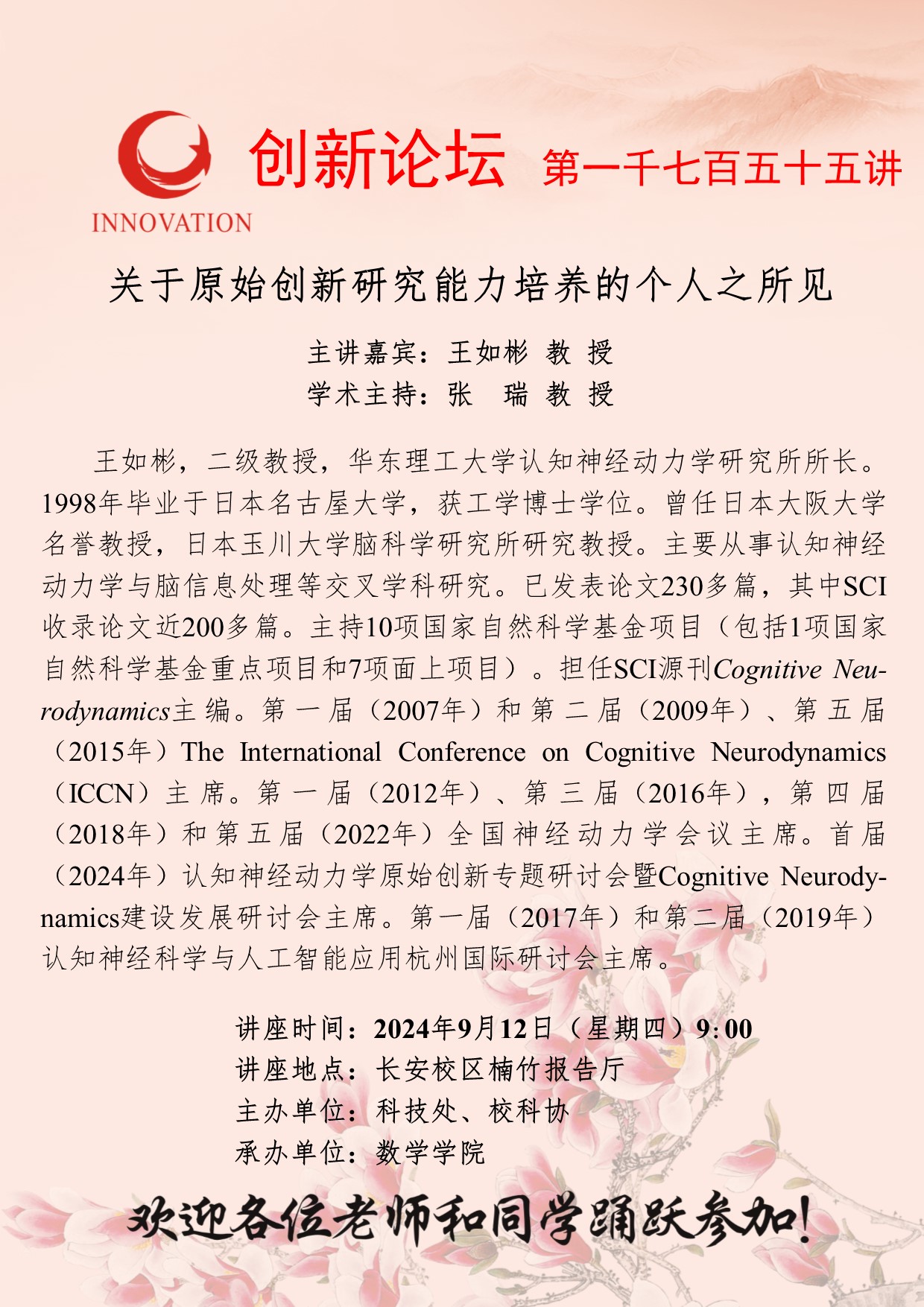 王如彬 教授 8868体育登录创新论坛第一千七百五十五讲:关于原始创新研究能力培养的个人之所见 讲座时间 2024年9月12日(星期四)9:00 讲座地点 长安校区楠竹报告厅 讲座人介绍 王如彬 教授 讲座内容