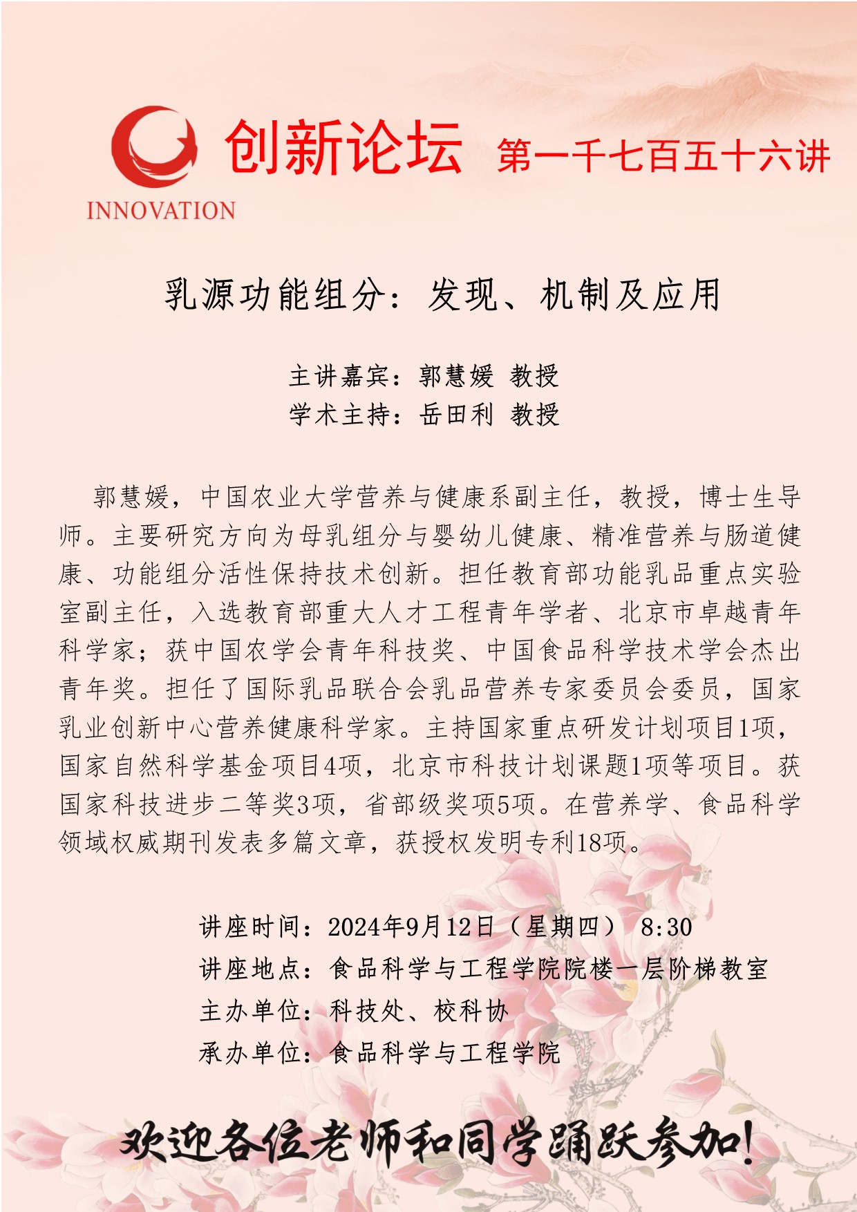 郭慧媛 教授 8868体育登录创新论坛第一千七百五十六讲: 乳源功能组分: 发现、机制及应用 讲座时间 2024年9月12日(星期四) 8:30 讲座地点 食品科学与工程学院院楼一层阶梯教室 讲座人介绍 郭慧媛 教授 讲座内容