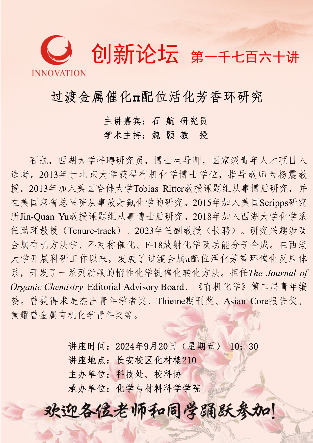 石航 研究员 8868体育登录创新论坛第一千七百六十讲:过渡金属催化π配位活化芳香环研究 讲座时间 2024年9月20日(星期五) 10:30 讲座地点 长安校区化材楼210 讲座人介绍 石航 研究员 讲座内容