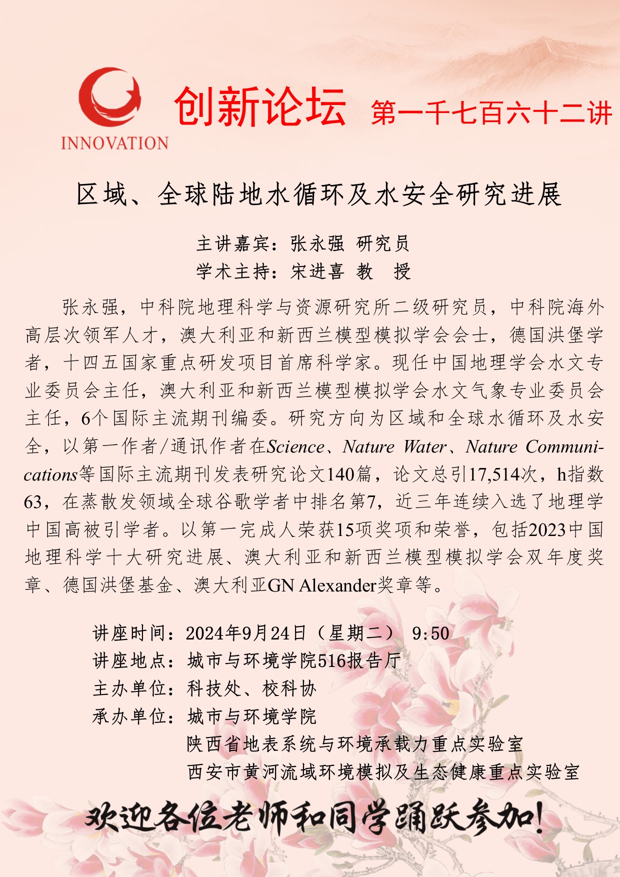张永强 研究员 8868体育登录创新论坛第一千七百六十二讲:区域、全球陆地水循环及水安全研究进展 讲座时间 2024年9月24日(星期二) 9:50 讲座地点 城市与环境学院516报告厅 讲座人介绍 张永强 研究员 讲座内容