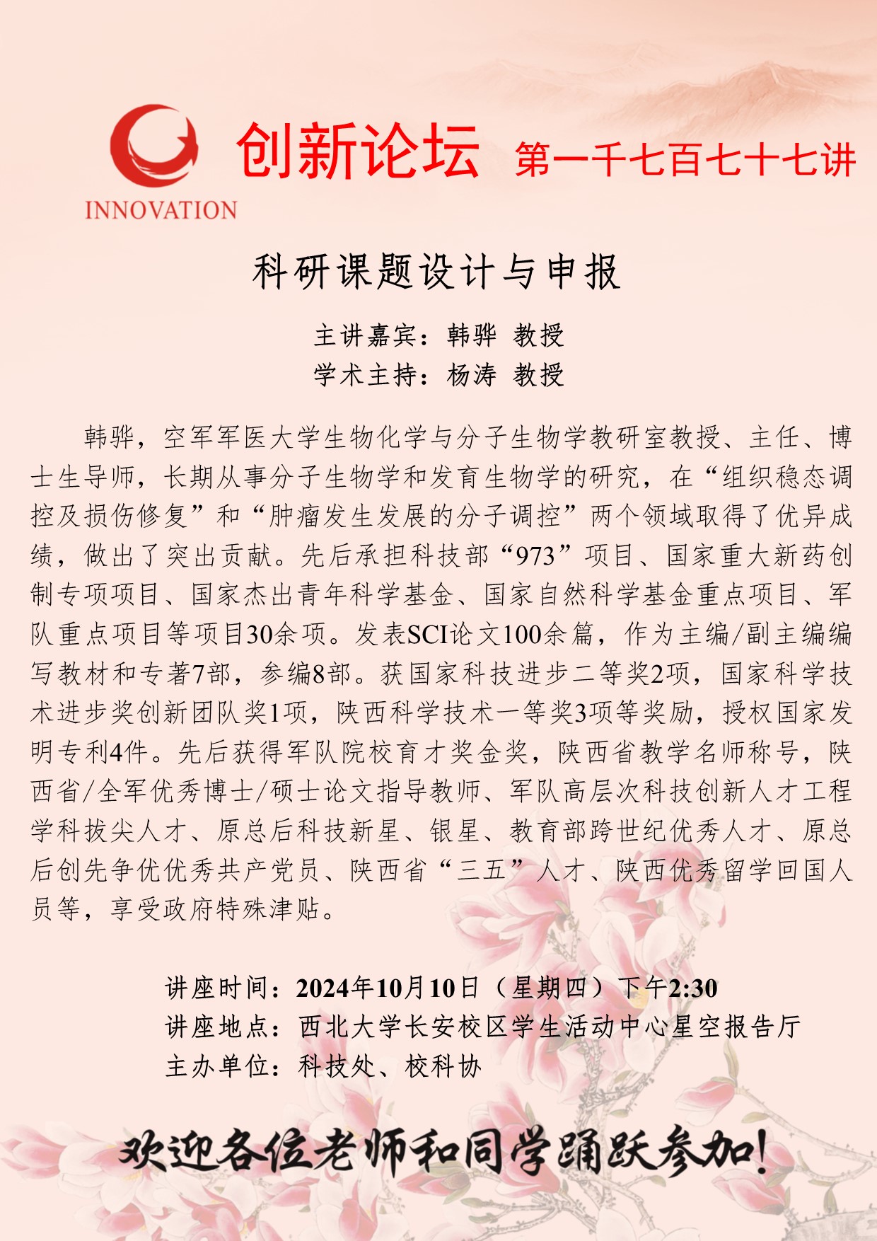 韩骅 教授 8868体育登录创新论坛第一千七百七十七讲:科研课题设计与申报 讲座时间 2024年10月10日(星期四)下午2:30 讲座地点 8868体育登录长安校区学生活动中心星空报告厅 讲座人介绍 韩骅 教授 讲座内容
