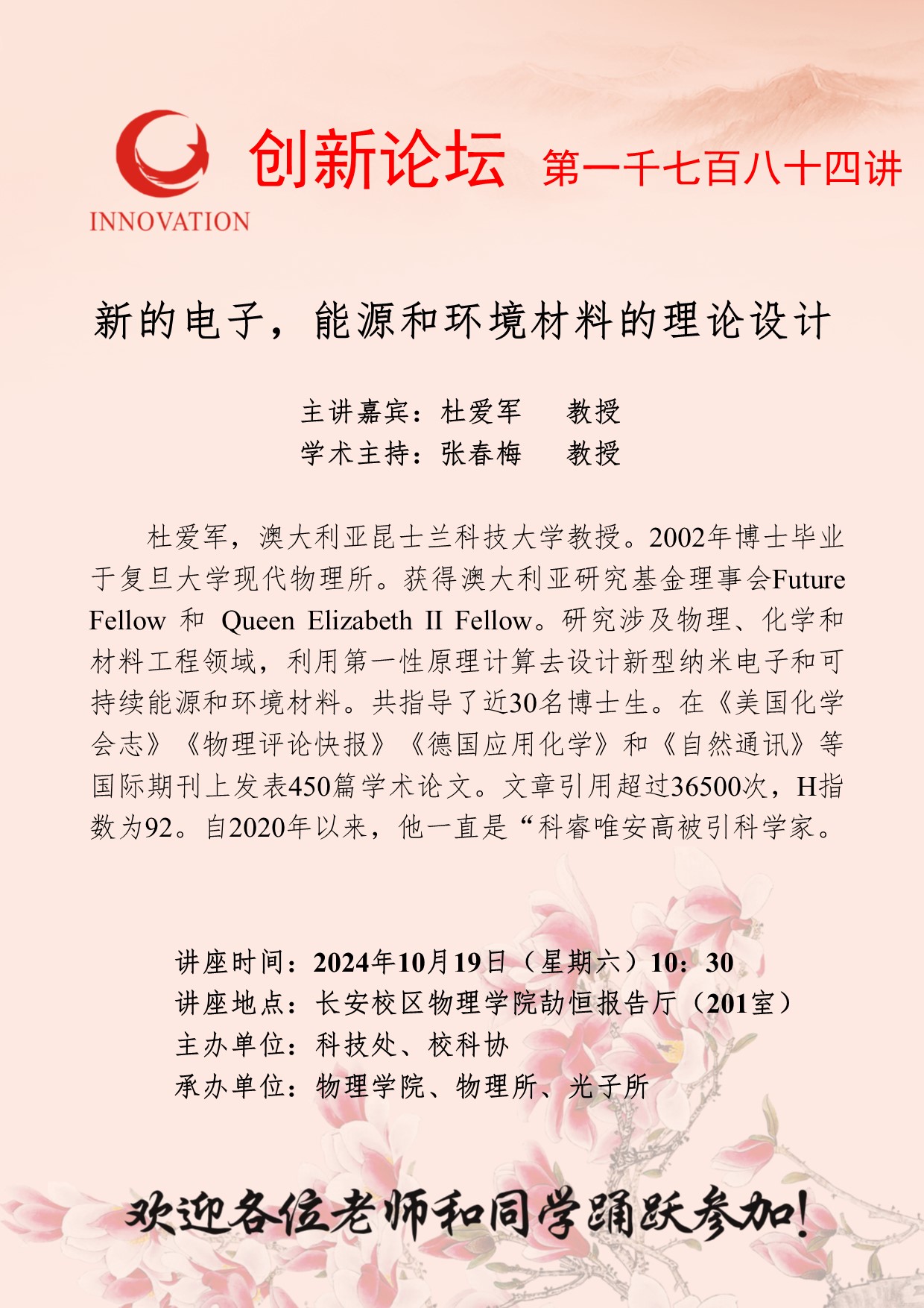 杜爱军 教授 8868体育登录创新论坛第一千七百八十四讲:新的电子,能源和环境材料的理论设计 讲座时间 2024年10月19日(星期六)10:30 讲座地点 长安校区物理学院劼恒报告厅(201室) 讲座人介绍 杜爱军 教授 讲座内容