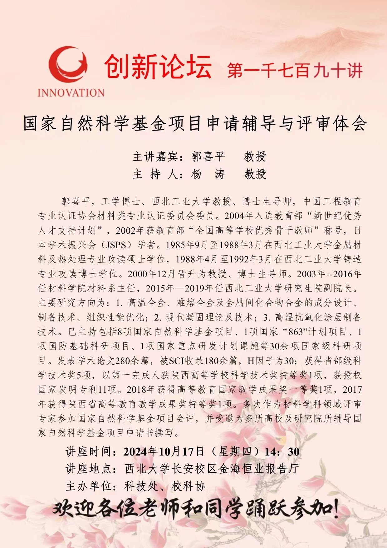 郭喜平 教授 8868体育登录创新论坛第一千七百九十讲:国家自然科学基金项目申请辅导与评审体会 讲座时间 2024年10月17日(星期四)下午2:30 讲座地点 8868体育登录长安校区金海恒业报告厅 讲座人介绍 郭喜平 教授 讲座内容