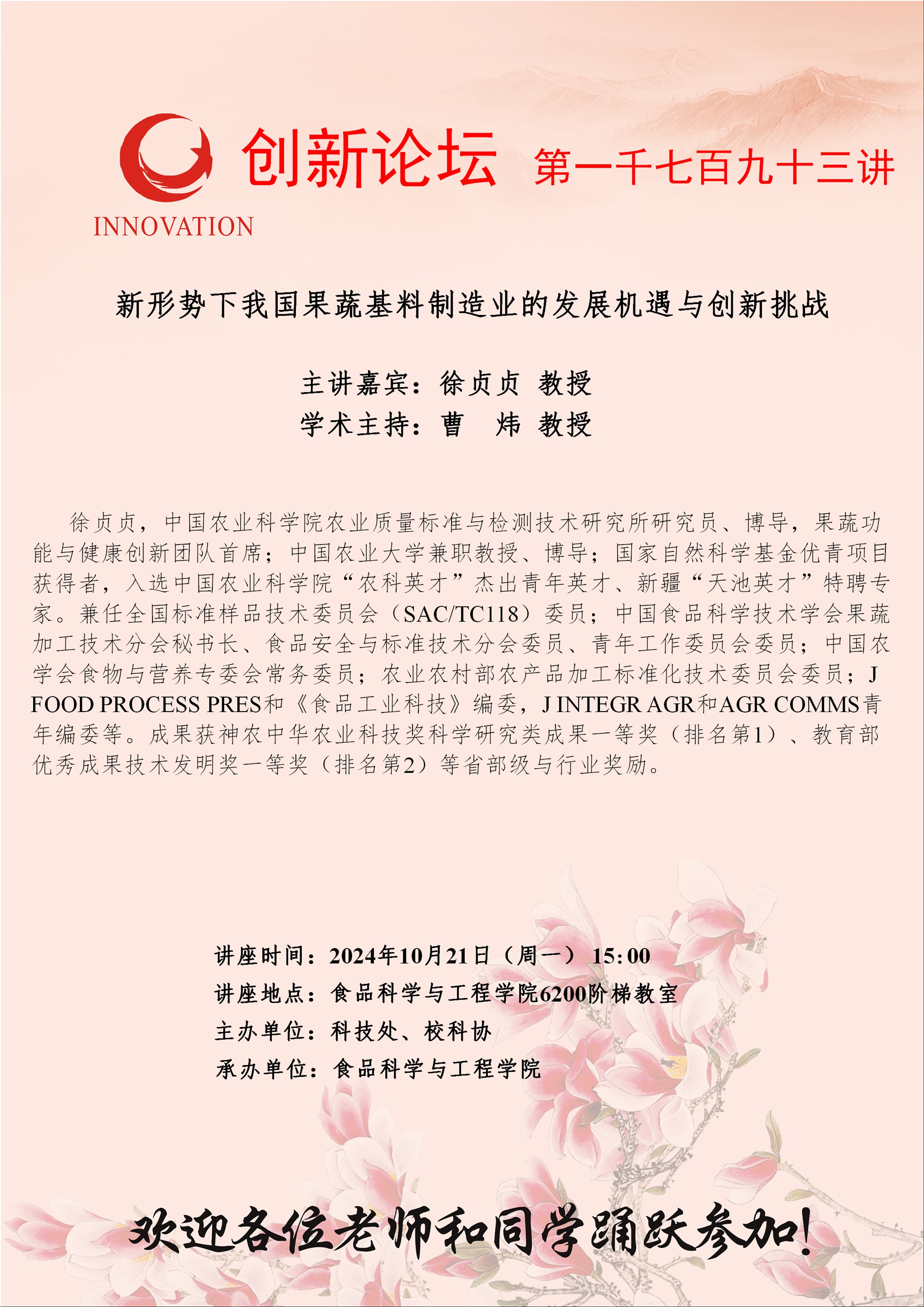 徐贞贞 教授 8868体育登录创新论坛第一千七百九十三讲: 新形势下我国果蔬基料制造业的发展机遇与创新挑战 讲座时间 2024年10月21日(星期一)15:00 讲座地点 太白校区食品科学与工程学院6200阶梯教室 讲座人介绍 徐贞贞 教授 讲座内容