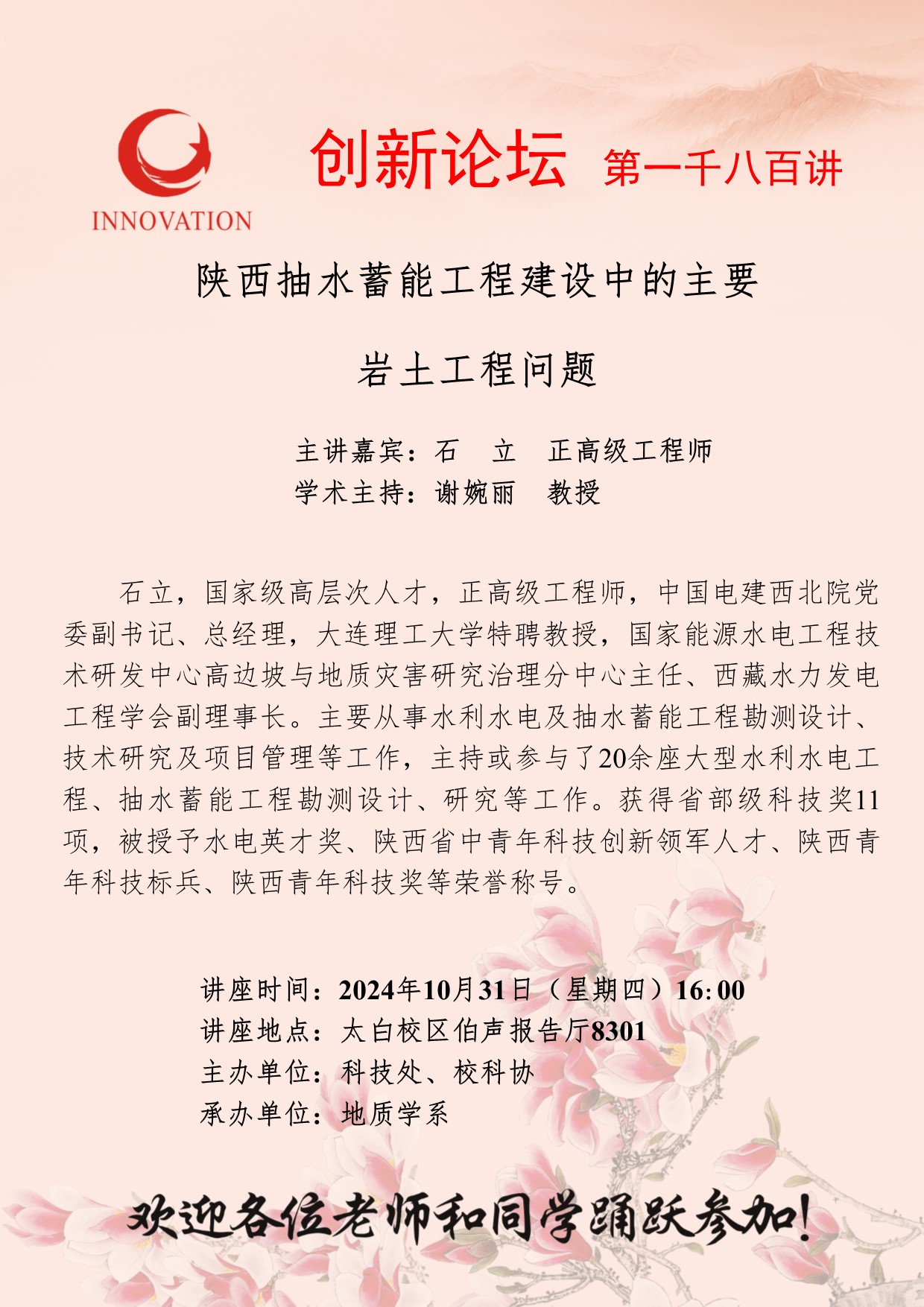 石 立 正高级工程师 8868体育登录创新论坛第一千八百讲:陕西抽水蓄能工程建设中的主要岩土工程问题 讲座时间 2024年10月31日(星期四)16:00 讲座地点 太白校区伯声报告厅8301 讲座人介绍 石 立 正高级工程师 讲座内容