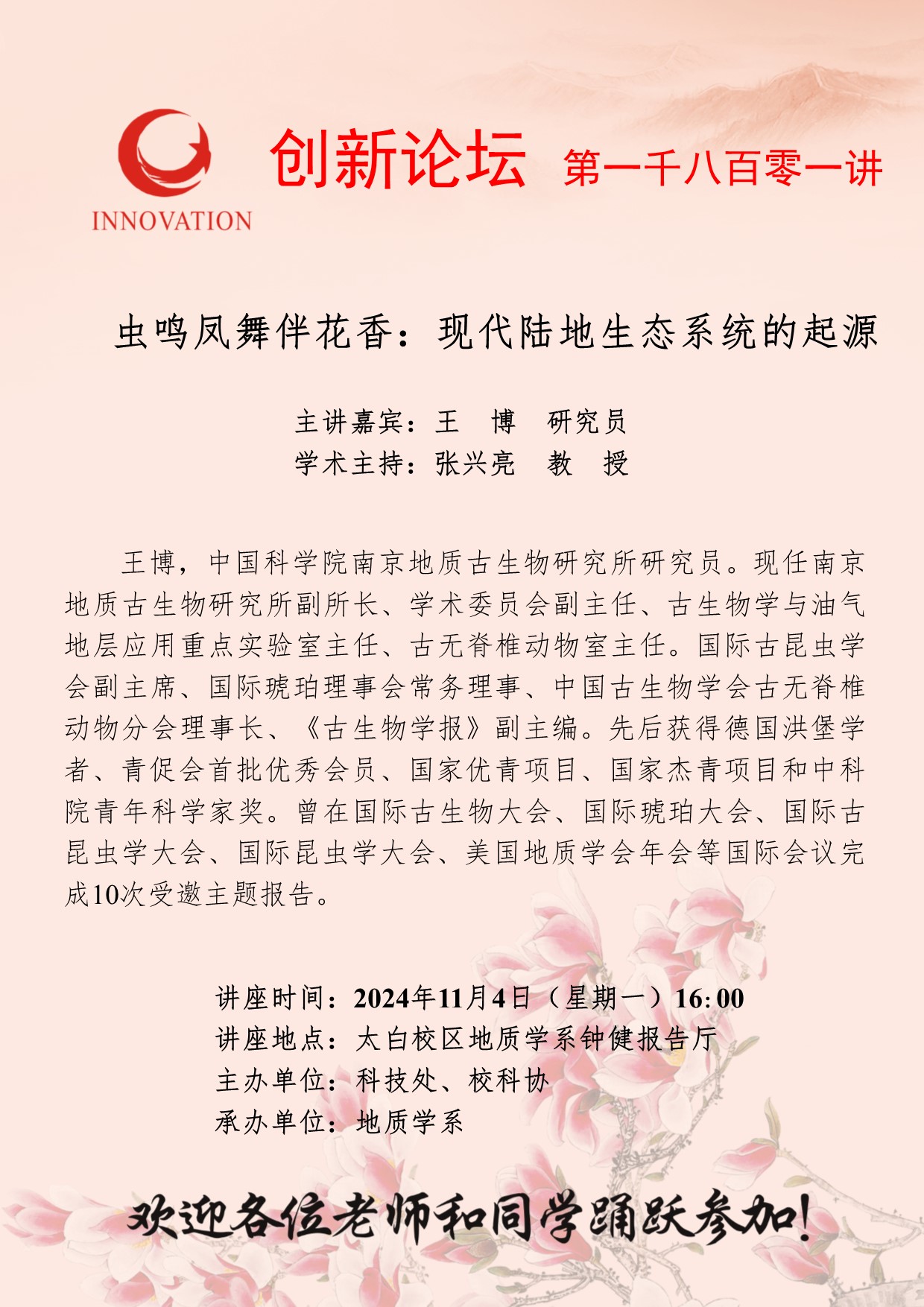 王 博 研究员 8868体育登录创新论坛第一千八百零一讲:虫鸣凤舞伴花香:现代陆地生态系统的起源 讲座时间 2024年11月4日(星期一)16:00 讲座地点 太白校区地质学系钟健报告厅 讲座人介绍 王 博 研究员 讲座内容